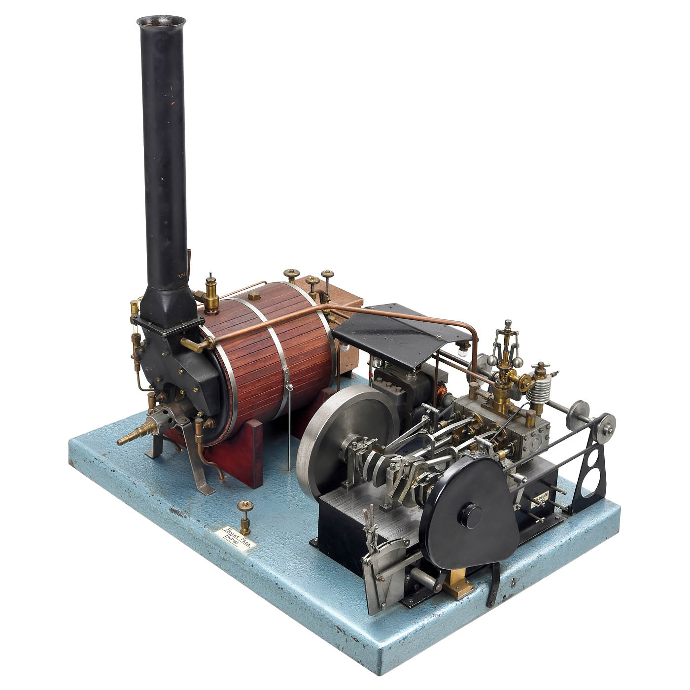 Two side-by-side 1 1/5 in. cylinders, crosshead guide in plane bearings, with reversible direction of rotation, sliding control with eccentric ring and reverse eccentric, working governor, horizontal wood-lagged boiler, Ø 5 ¼ in., gas firing, manometer, water gauge level, water container, feed pump, spoked flywheel Ø 5 in., 4-volt dynamo, driven by chain and belt, roof with 6 lamps, transmission with 6 belt drives, on metal base, 19 x 14 in.