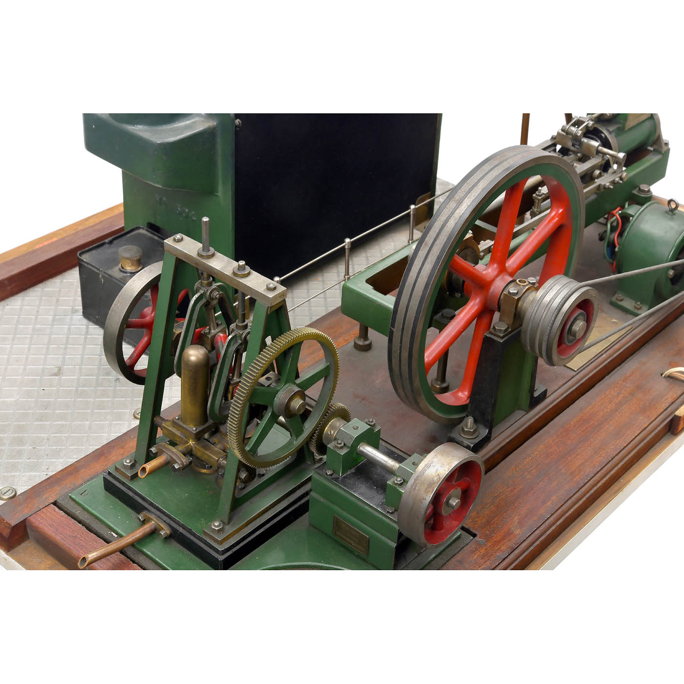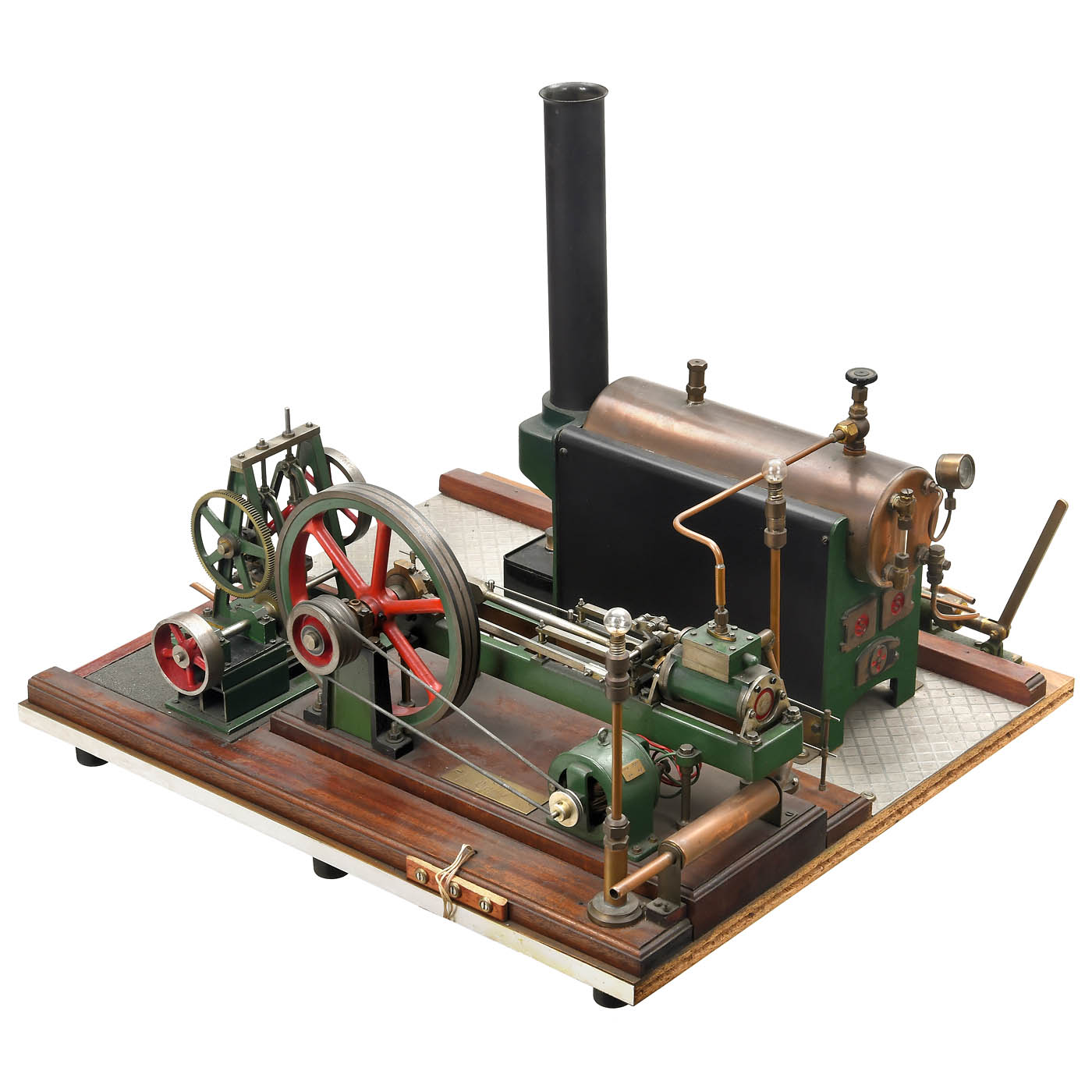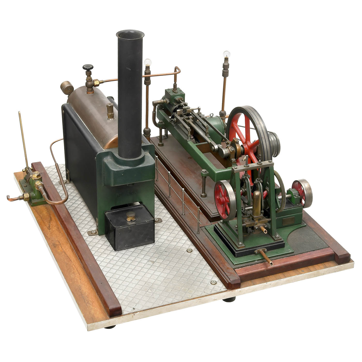 Horizontal single-cylinder steam engine, crosshead guide, slide valve control with eccentric ring, cylinder Ø 1 ½ in., flywheel Ø 6 7/8 in., pulley, 4-volt dynamo, 2 lamps, belt-driven two-piston water pump, with maker's plate "Engineer R. Stock, Loughborough", boiler No. 504 by Stuart Turner, with manometer, water-level glass and spirit burner, manual feed pump, on wood board, 23 x 20 7/8 in.
