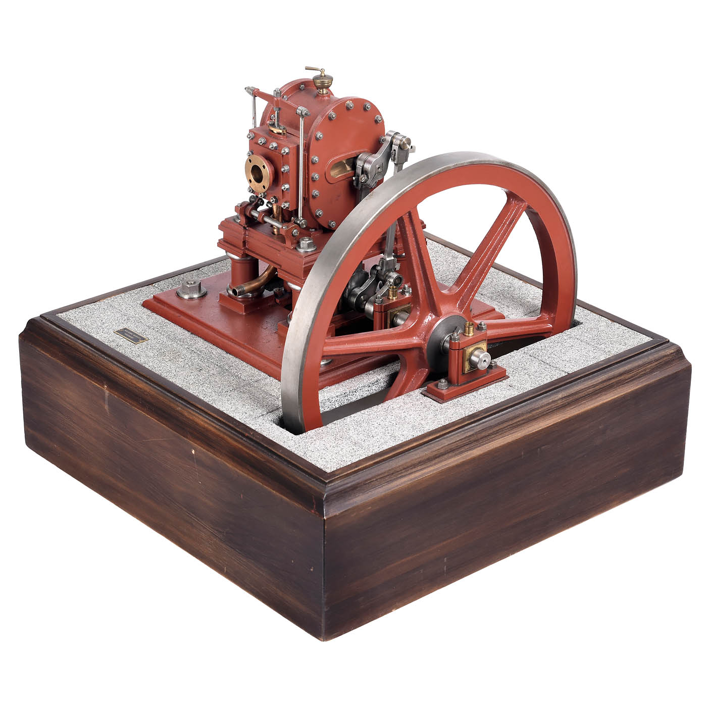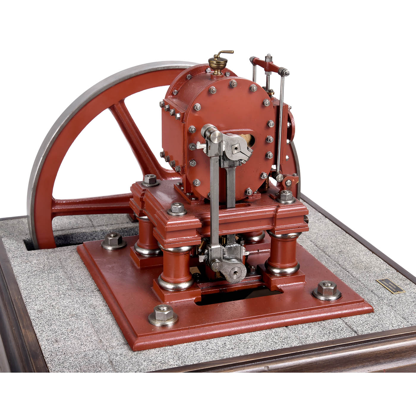 Wolfgang Neubauer, Paderborn, Germany. Polished-steel, cast-iron and brass construction, oval cylinder housing on 4 pillars over crankshaft, eccentric slide-valve control, spoked flywheel Ø 9 in., on wood base, overall dimensions 11 ¾ x 11 ¾ x 10 ½ in. – An unusual and very well constructed model, in working condition.