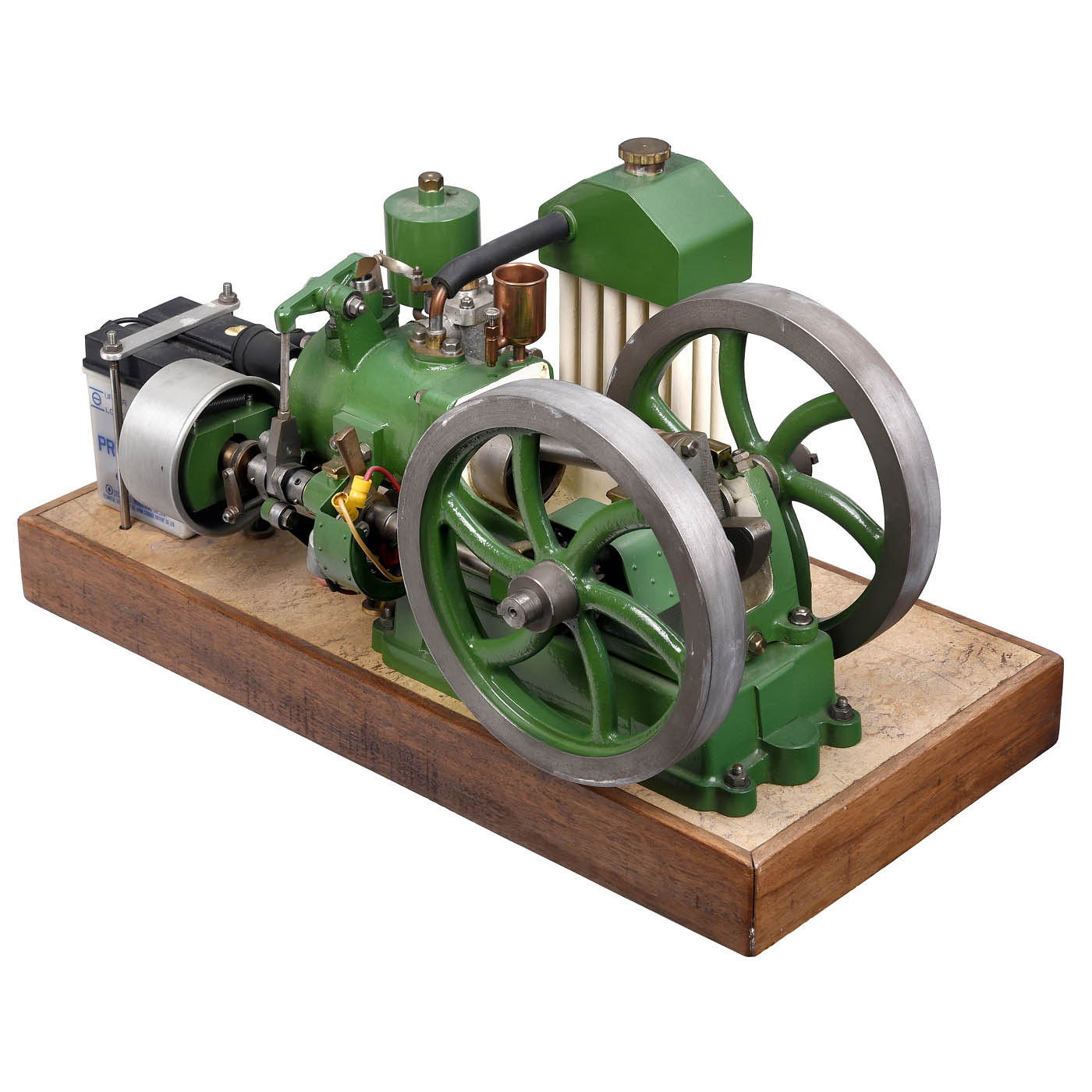 By L.J. Evans, water-cooled four-stroke petrol engine with horizontal cylinder, ignition with breaker and ignition coil, open crank pistons with crosshead guide, cast-iron housing, two 6 9/10 in. flywheels, centrifugal governor-controlled injector, radiator with 18 pipes, gearbox with control shaft, exhaust with silencer, brass oiler, fuel tank and battery, on wood base, 18 7/8 x 9 7/8 10 ½ in. – A very well engineered working model.