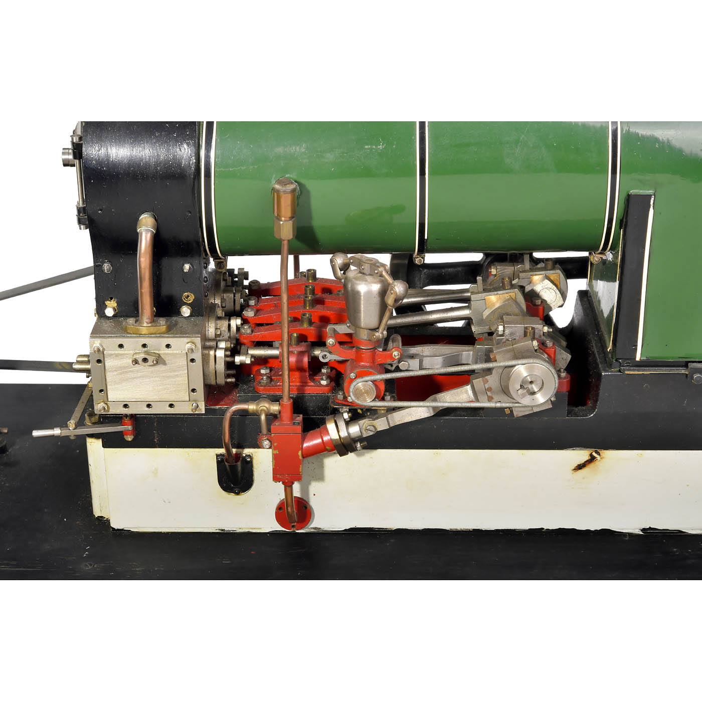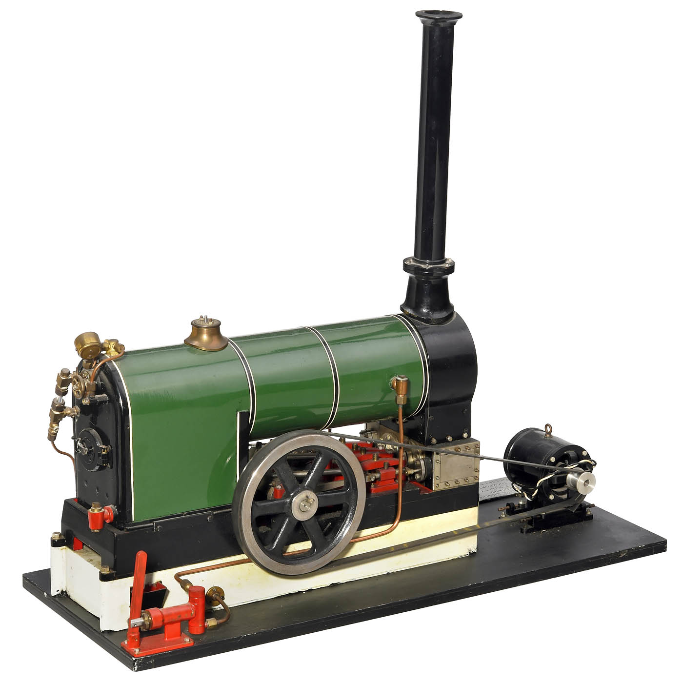 Stationary Undertype Steam Engine with Dynamo Two-cylinder compound steam engine, with high and low-pressure cylinders, Ø 1 7/10 and 1 1/10 in., crosshead guide, slide control with eccentric rings, feed pump, speed regulator, soldered brass flame tube boiler, manometer, water-level glass, dynamo with belt drive, on wood plate, 20 x 7 7/8 in.