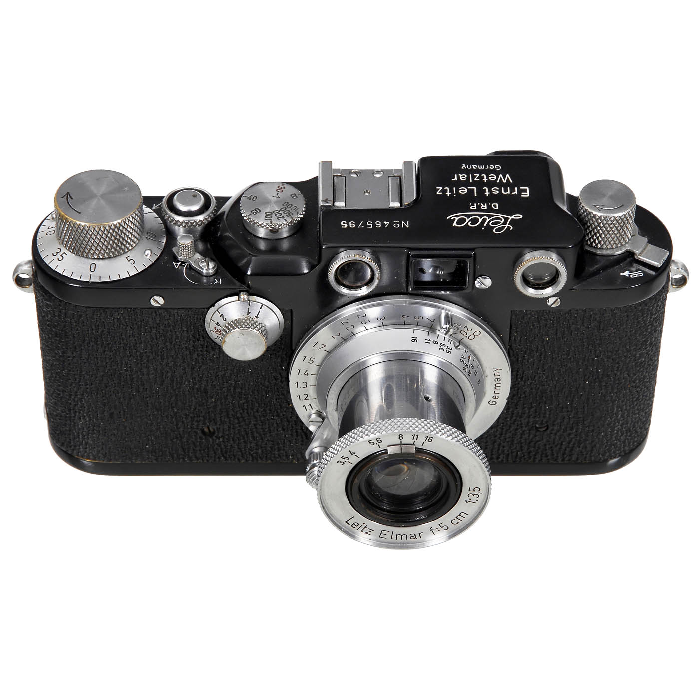 Leitz, Wetzlar. No. 465795 with Elmar 3.5/5 cm (without serial number), camera professionally refinished in black, chrome elements and lens very clean. Attractive camera for the display case or active use!
