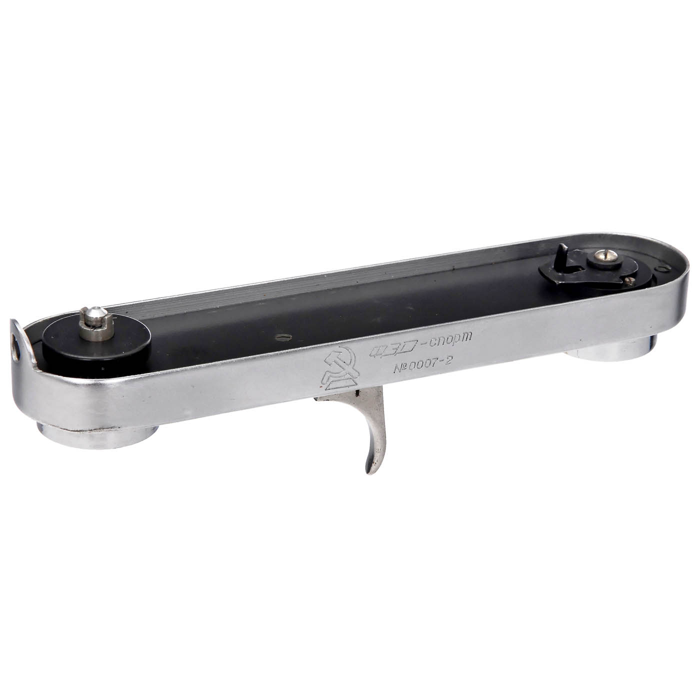 1) USSR. Leicavit-like fast winder, engraved with hammer and sickle, "FED Sport" (in Cyrillic) and "No. 0007-2", mechanism works when removed from the camera. (3/3) – And: 2) FED 1f No. 223337 with FED 2/50 mm No. 29864, camera unchecked. (3-/–)