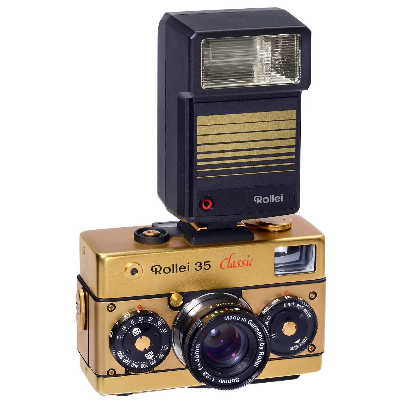 Rollei, Brunswick. No. 920115, from a limited edition of 500 units, with Sonnar 2.8/40 mm, wrist strap with gold band, cap and case (simple version). – In addition: Rollei flash 20REB, gold pattern on the front (function unchecked).