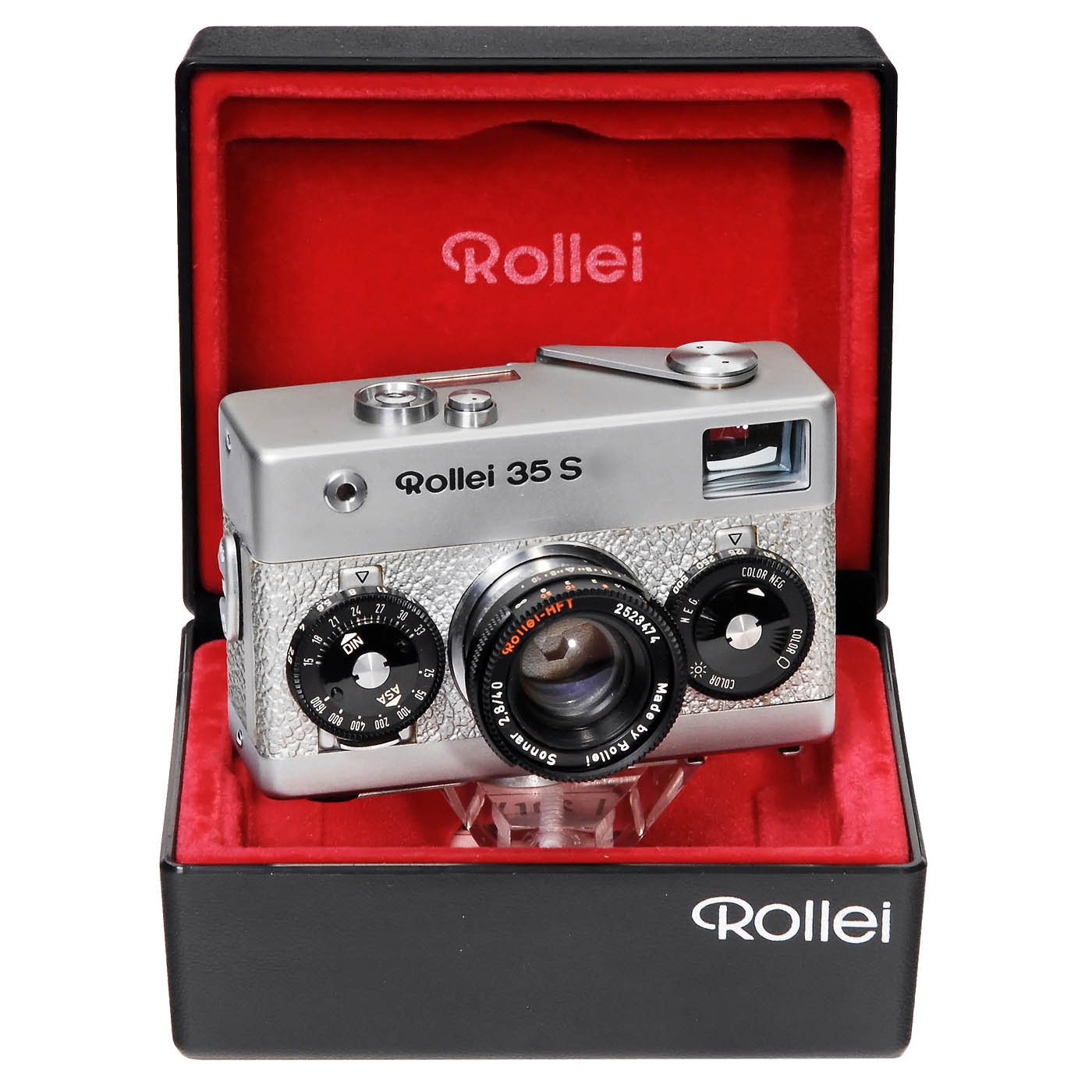 Rollei, Singapore. 1) Rollei 35 S with laurel wreath, Sonnar 2.8/40 mm, no. 2603238, with case, wrist strap and case. This version was intended for US export. (2/2) – And: 2) Rollei 35 S with Sonnar 2.8/40 mm, no. 2523474, engraved name plate on the back, with wrist strap, casket and outer box. (3-/2)
