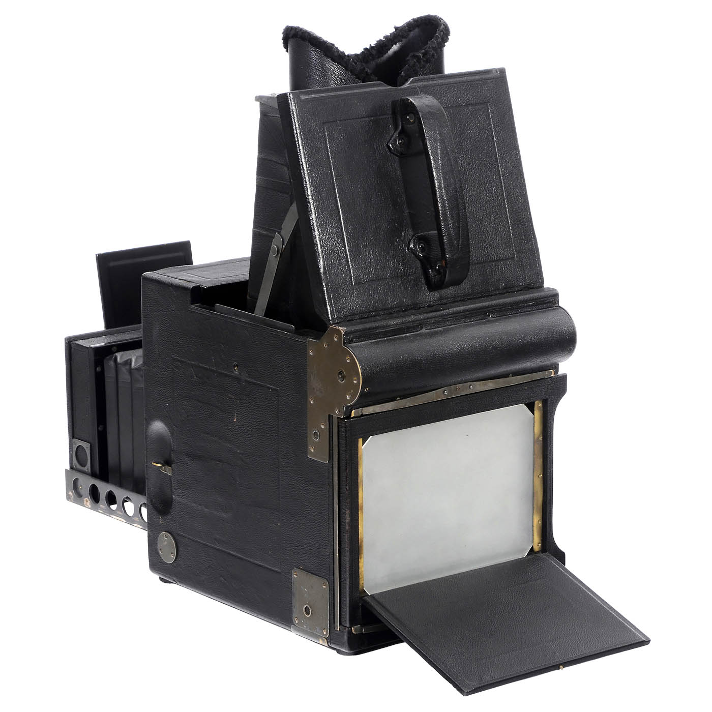 Folmer & Schwing, Eastman Kodak, Rochester. For 5 x 7 in. vertical format, focal plane shutter works, for shutter speeds from 1/10 up to 1/1500 sec., with 2 lenses: T, T & H Cooke Anastigmat 4.5/ 8 in. no. 63533 and Carl Zeiss Jena Fliegertruppen Tessar 4.5/25 cm no. 301533 (Fliegertruppe = German airforce 1914–1918), focal plane shutter cloth good. Classic press camera from period 1902–1930. All in excellent condition!
