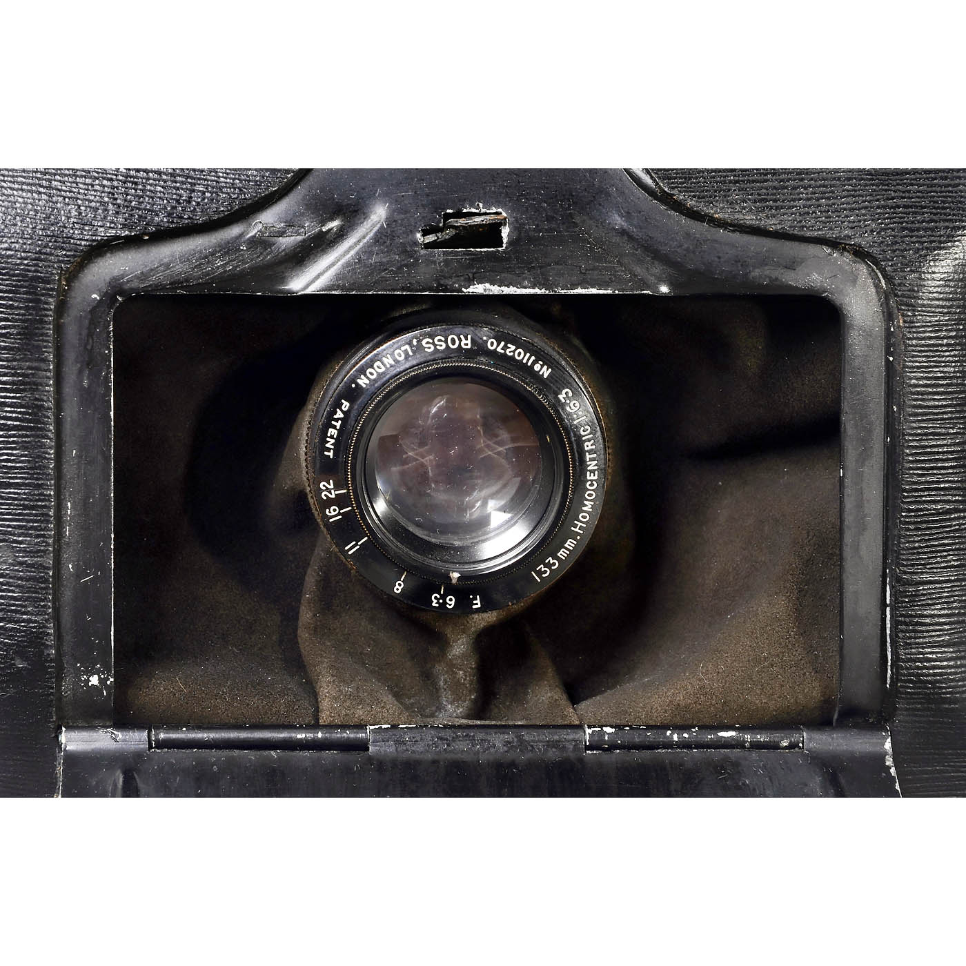 Eastman Kodak, Rochester. Camera no. 1416, for Kodak film A-122, with Ross Homocentric 6.3/133 mm no. 110270, iris diaphragm from 6.3 to 22, shutter works intermittently, in near-mint condition.