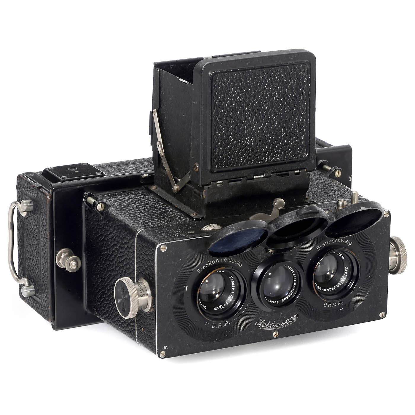 Franke & Heidecke, Braunschweig. No. 48668, stereo camera for plates of 6 x 13 cm with magazine no. 16195 with plate-holders, image size 6 x 6 cm, with Carl Zeiss Jena Tessar 4,5/7,5 cm lenses, Zeiss Sucher-Triplett 4,2/7,5 cm, iris diaphragms 4,5 to 25, central stereo shutter B, Z, 1–1300 sec. working, focusing screen without spirit level.
