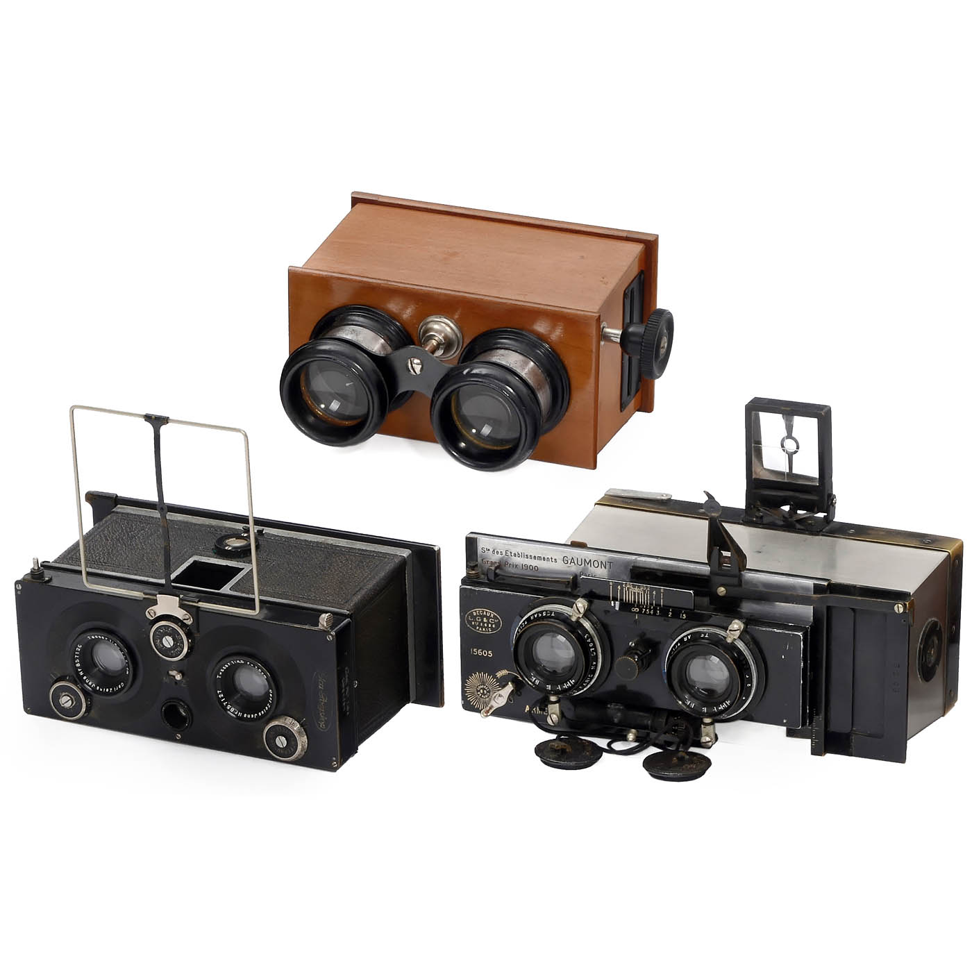 1) Gaumont, Paris, Stereo Spido Metallique A, for stereo pairs of 6 x 6 cm and panorama images of 6 x 13 cm, Krauss Tessar 4,5/85 mm, with 5 cassettes and case, shutter works. (3/3) – 2) Zeiss Ikon, Dresden. Ica-Polyskop for stereo pairs of 6 x 6 cm on 6 x 13 cm plates, Zeiss Tessar 4,5/7,5 cm, focusing up to 1,5 m, with focusing screen back, 12 721/004 cassettes and case, Compur working, water level intact, full-working condition. (3–4/3) – And: 3) ICA Stereoskop 628/6 for 45 x 107 mm slides, with original maker's box. (2-/3)