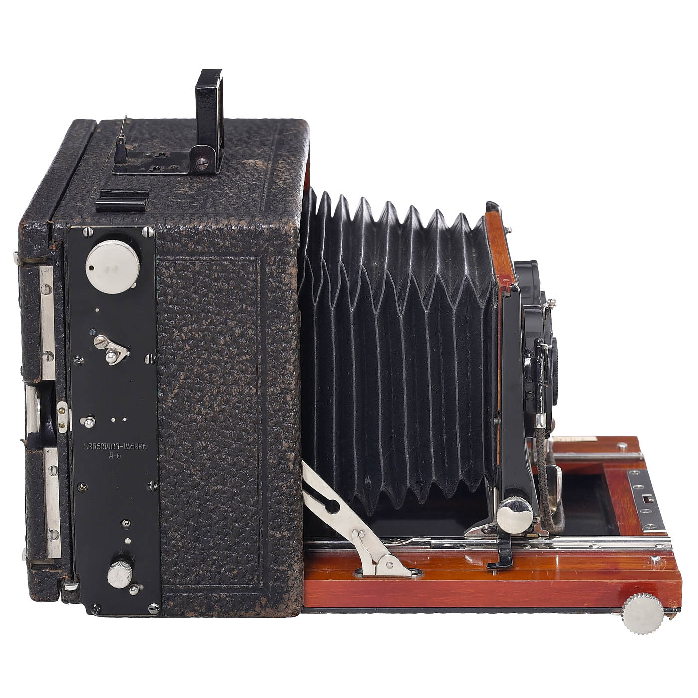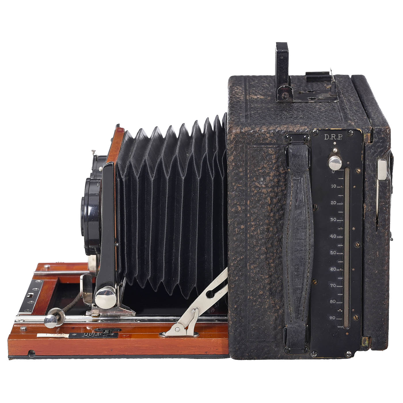 Ernemann, Dresden, for 10 x 15 cm, triple extension, metal camera front with changeable lens board, Goerz Rapid-Weitwinkel-Lynkeioskop 6/12 cm, nos. 46755 and 46756, in Ernemann Automat 0–Z-1/100-1 shutter, focusing screen back with lift-up for thin single Hemera cassettes, ejection lever, screen on left side with clear glass for reading the mm-scale of the focal plane shutter, optics clean, slow shutter times uniform, both shutter curtains good but with limited movement.