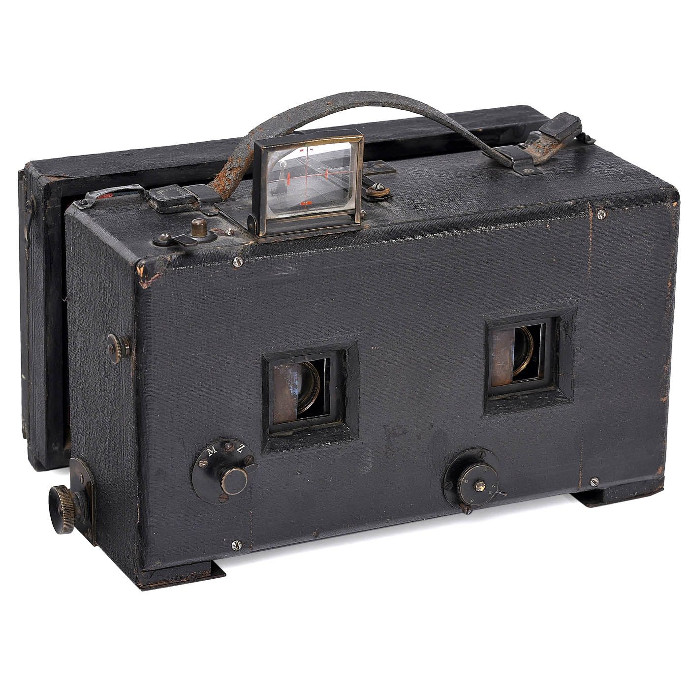 Unmarked, probably Germany/Austria, case front with 2 periscope lenses and adjustable shutter M and Z, green bellows with red leather corners, rear bellows extension with side-mounted drive, focusable from infinity to approx. 2.5 m, focusing screen back, shutter partially working, missing a retaining screw from focusing mechanism. – Note: Though not listed in the standard reference works, the construction of this camera is reminiscent of the Ernemann Edison, however with the addition of an original iron reinforcement plate on the underside.