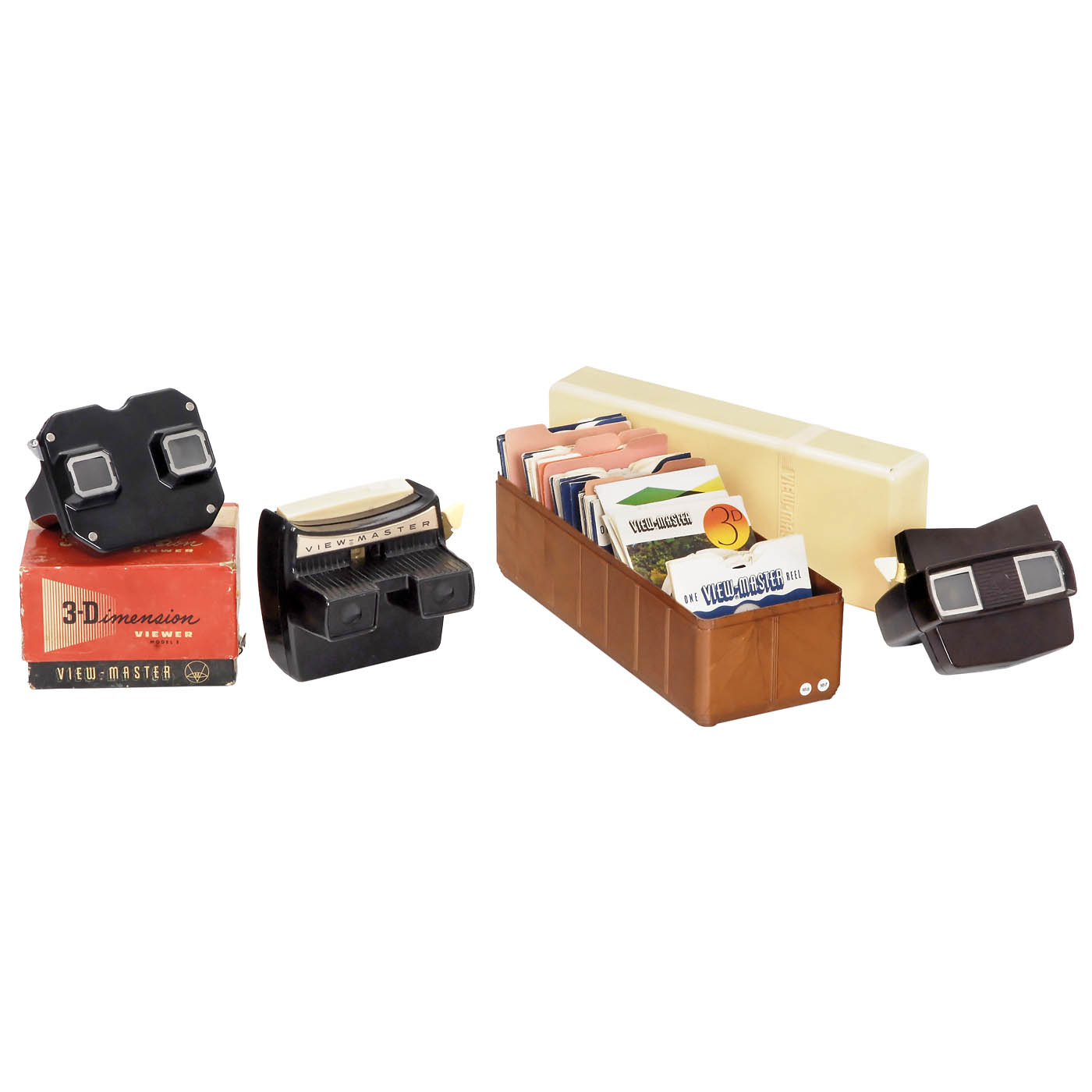 1) London Stereoscopic Company. Deluxe stereo viewer for 9 x 18 cm slides and cards, burr-wood veneer, missing focusing device and small section of wood on the rear, otherwise in good condition. With colored slide "Departure of Troops" in Japan, c. 1904, cracks, rare. (3/–) – 2) Early prism handheld viewer for 9 x 18 cm slides and cards, with folding front and 8 early American stereo cards. (3-/3) – 3–6) 4 Brewster handheld viewers for stereo cards of 9 x 18 cm, including Underwood and The "Saturn" Scope. (3/3) – 7) Roses Optik, Stockholm Uppsala. Metal stereoscope. (3-/3) – 8) Underwood stereo cards, 39 genre scenes, 32 of America, 14 of Italy, 15 of Scandinavia and 52 from around the world, usual condition for their age. – And: 9–11) 3 Viewmaster viewers and a box of 40 Viewmaster discs and leaflets.