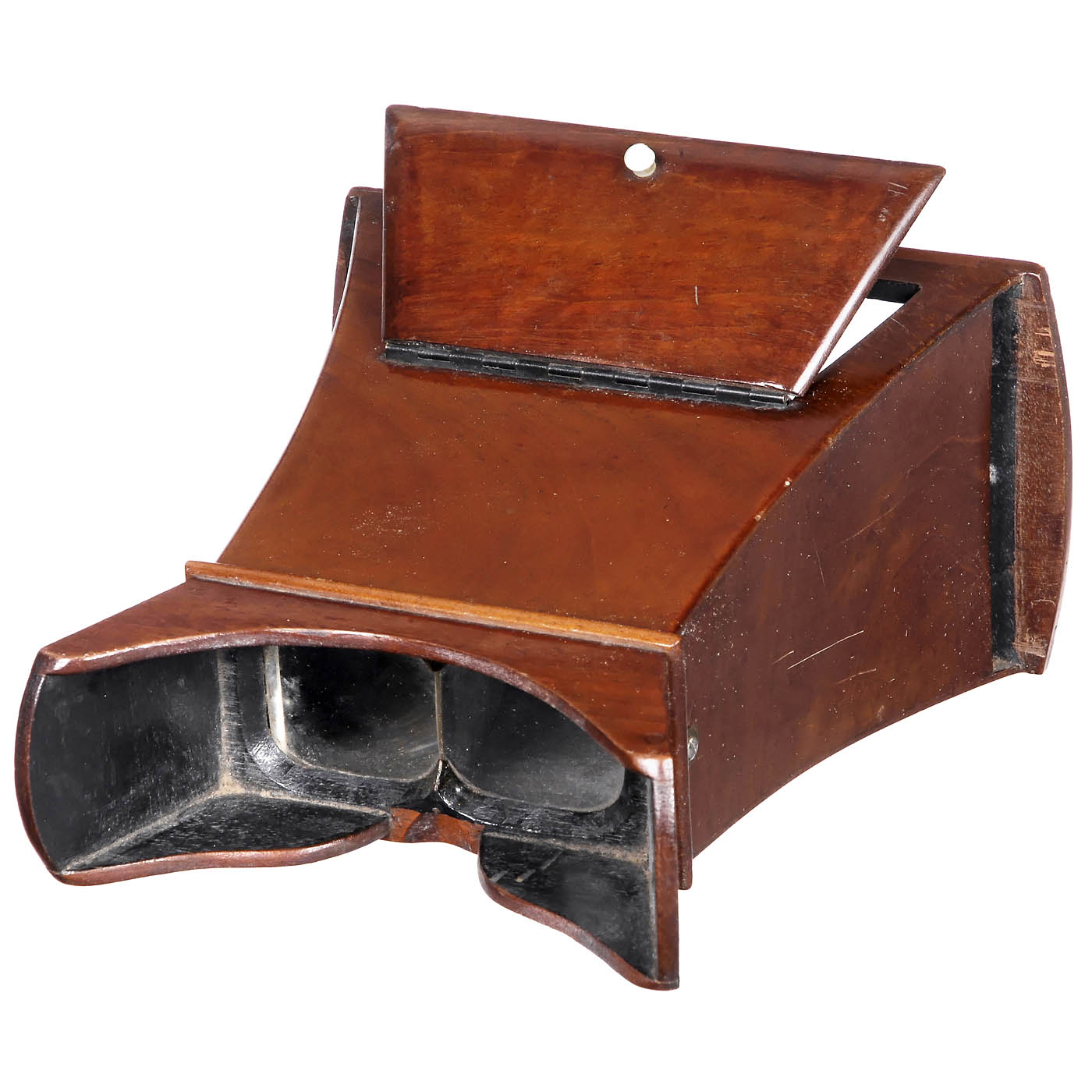 1) For cabinet photographs and stereo cards of 9 x 18 cm, with movable holder, body closed 8 ½ x 6 in., height 13 in., loupe 3 ¾ in. – And: 2) Early Brewster-type stereoscope, 2 screws replaced, without frosted glass, mirror replaced with silver-bronze