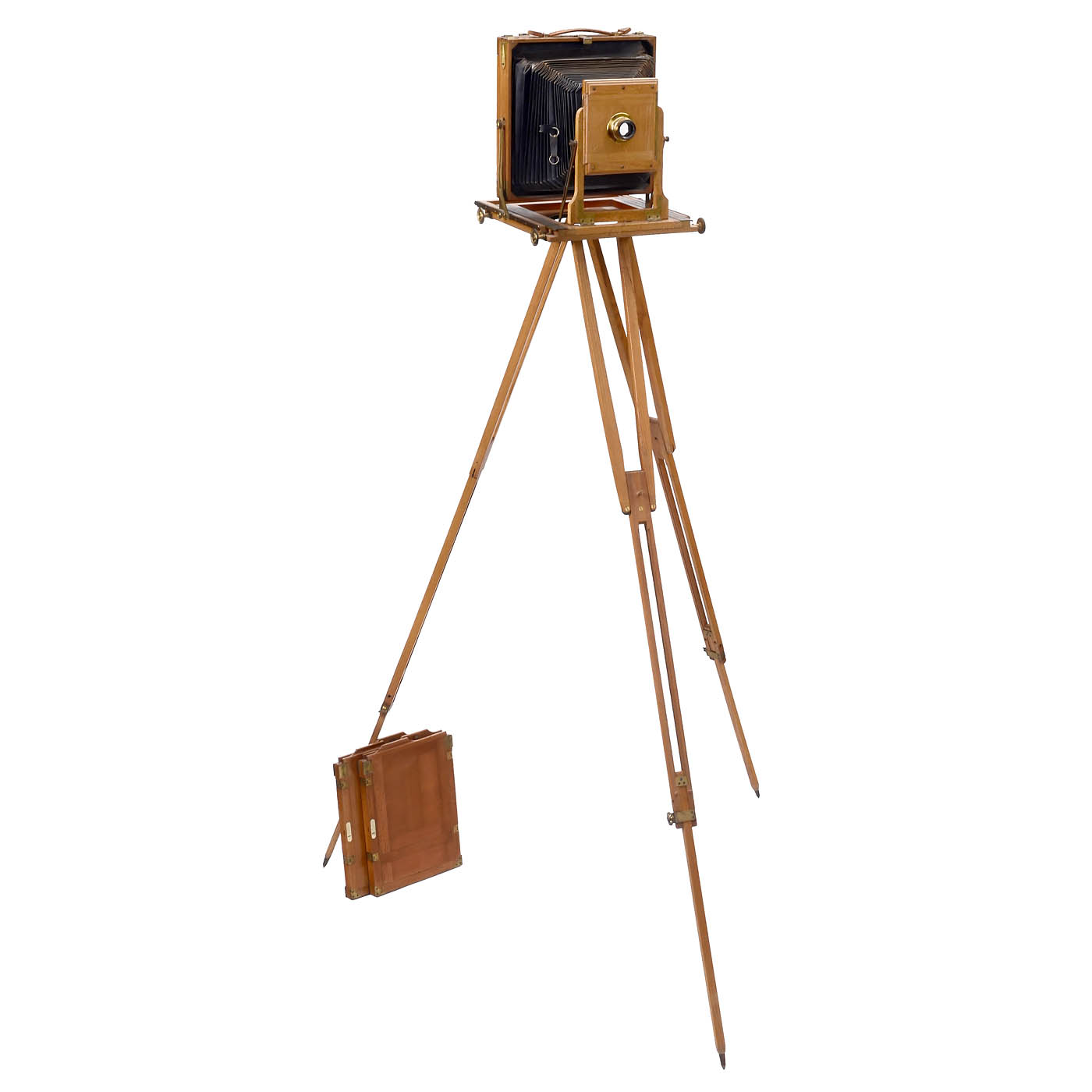 Germany, 18 x 24 cm, similar to the ICA Perfect for double extension, light-colored wood with tripod of the same tone, rotatable tripod collar with lock built into the camera, interchangeable lens plate with Meyer wide-angle Aristostigmat 9/160 mm no. 402775 and 2 double cassettes, bellows stiff in two of the top folds and presumably no longer light-proof, camera in otherwise good condition.