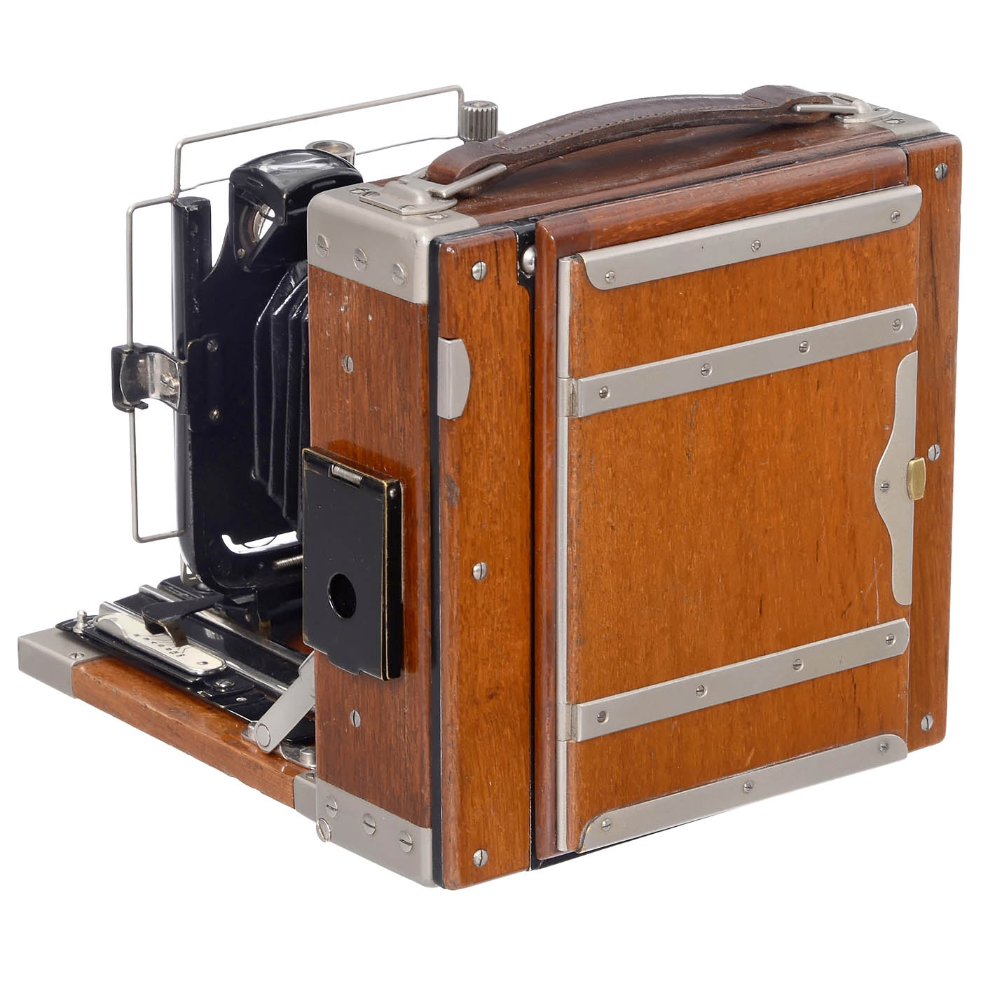 ICA, Dresden. Tropica, body no. J.55869, for plates of 9 x 12 cm, tropical wood with matt chromed fittings, Carl Zeiss Jena Tessar 4.5/13.5 cm no. 582285 and focusing screen back, Compur shutter works. – In near-mint condition!