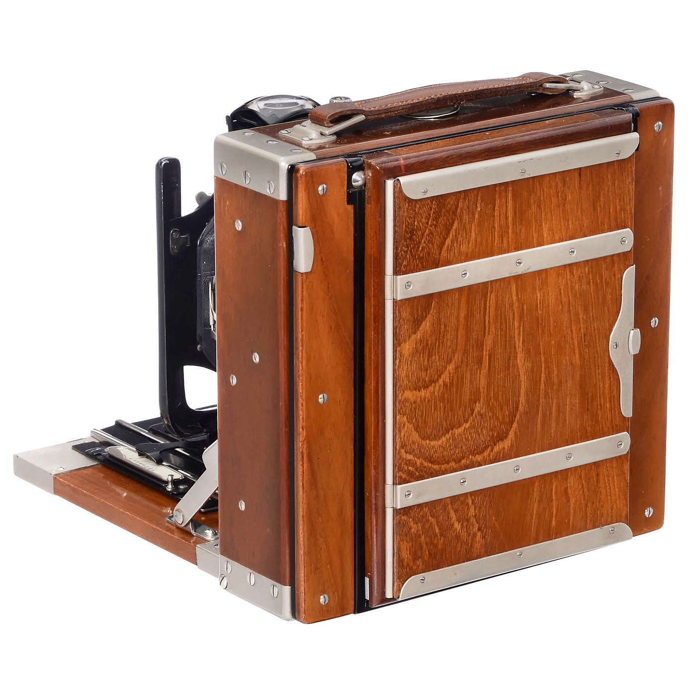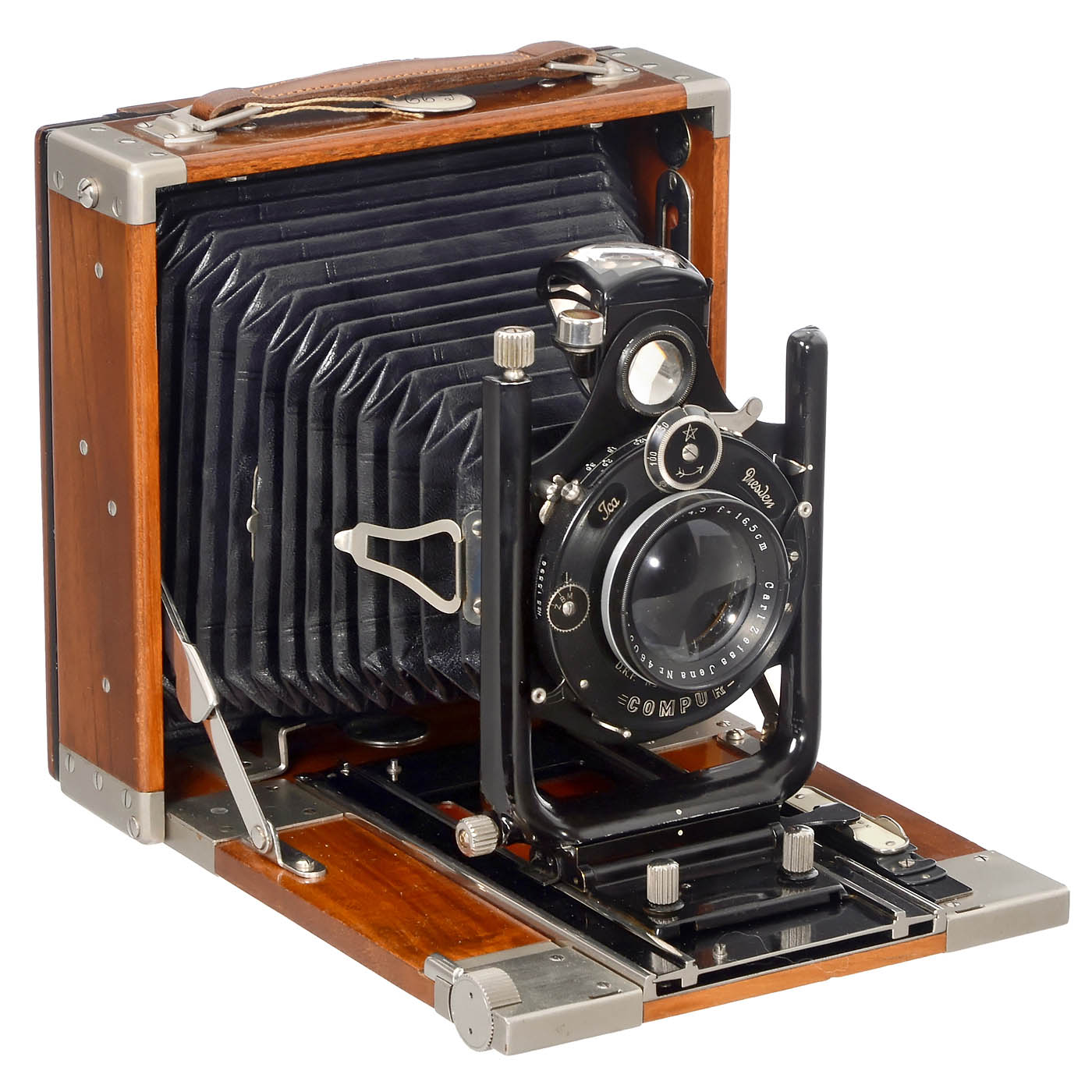 ICA, Dresden. Tropica, body no. G.96552, for plates of 10 x 15 cm, tropical wood with matt chromed fittings, Carl Zeiss Jena Tessar 4.5/16.5 cm no. 460842 and focusing screen back, Compur shutter works. – In near-mint condition!