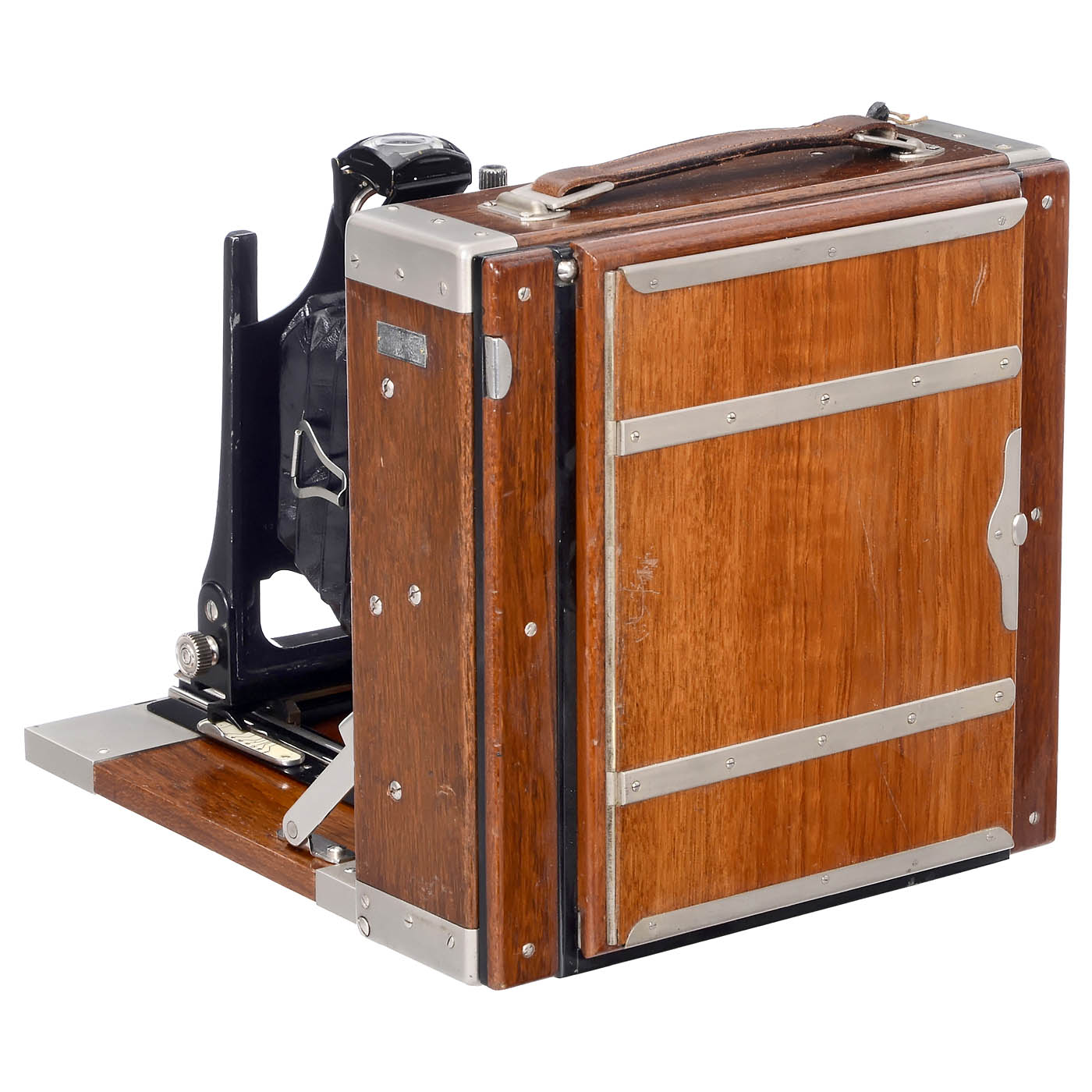 ICA, Dresden. Tropica, body no. 49184, for plates of 13 x 18 cm, tropical wood with matt chromed fittings, Carl Zeiss Jena Tessar 6.3/21 cm no. 232802 and focusing screen back, Compound shutter works. – Camera still with its customs seal and in near-mint condition!