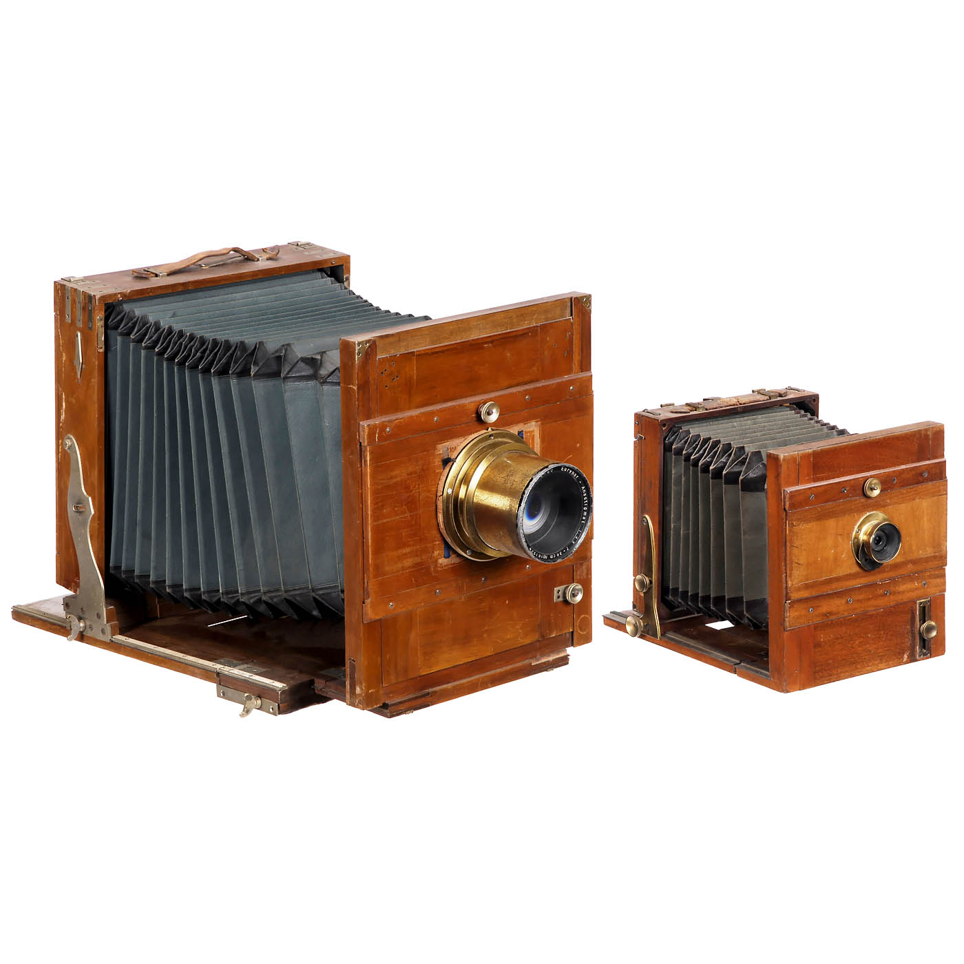 Germany. 1) Field camera, for 13 x 18 cm, light-brown bellows, double extension (one lock missing), with brass-bound wide-angle Aplanat No. 2 lens by Emil Busch, Rathenow, focal length approx. 12 cm, rotating stop, glass clean, with screen back, torn carrying strap. (3/3) – 2) Traveling tripod with crank column and tilting head, for heights from 106 to 146 cm. (3-/3) – 3) Eurynar Anastigmat 4.5/36 cm three-element lens, No. 161526, by Rodenstock, Munich, with screw ring and cap, some dust on the inside. (3/3) – And: 4) Field camera, 24 x 30 cm, rare construction with separate extension for the inner slide to the front, as well as normal extension to the back (stiff), green bellows and focusing screen back, back missing glass and some screws. (4/4)