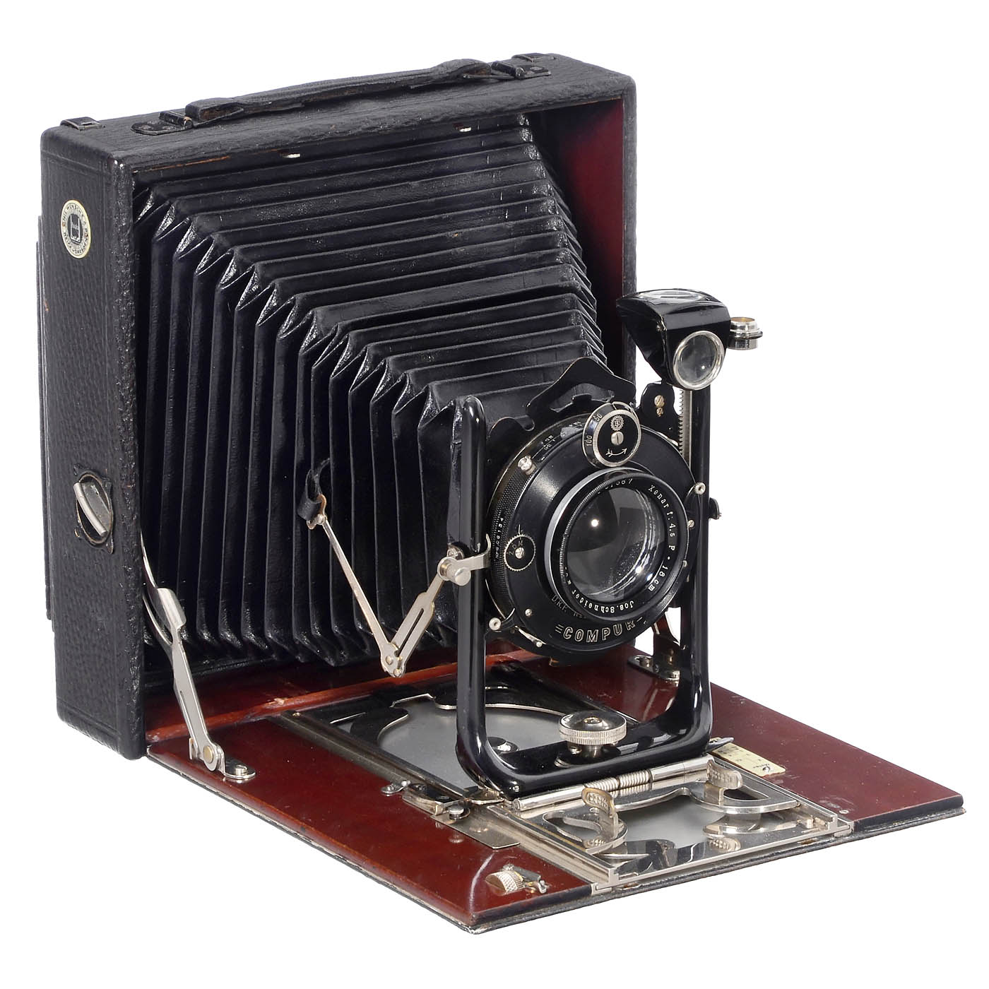 Emil Wünsche, Reick near Dresden. 13 x 18 cm, dark-red polished tropical wood interior, nickel-plated fittings, foldable baseboard, with very early Schneider Xenar 4.5/18 cm no. 61567 and focusing screen back, clean glass, fine original condition.