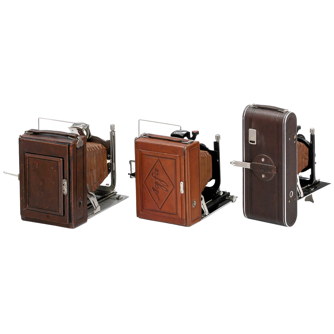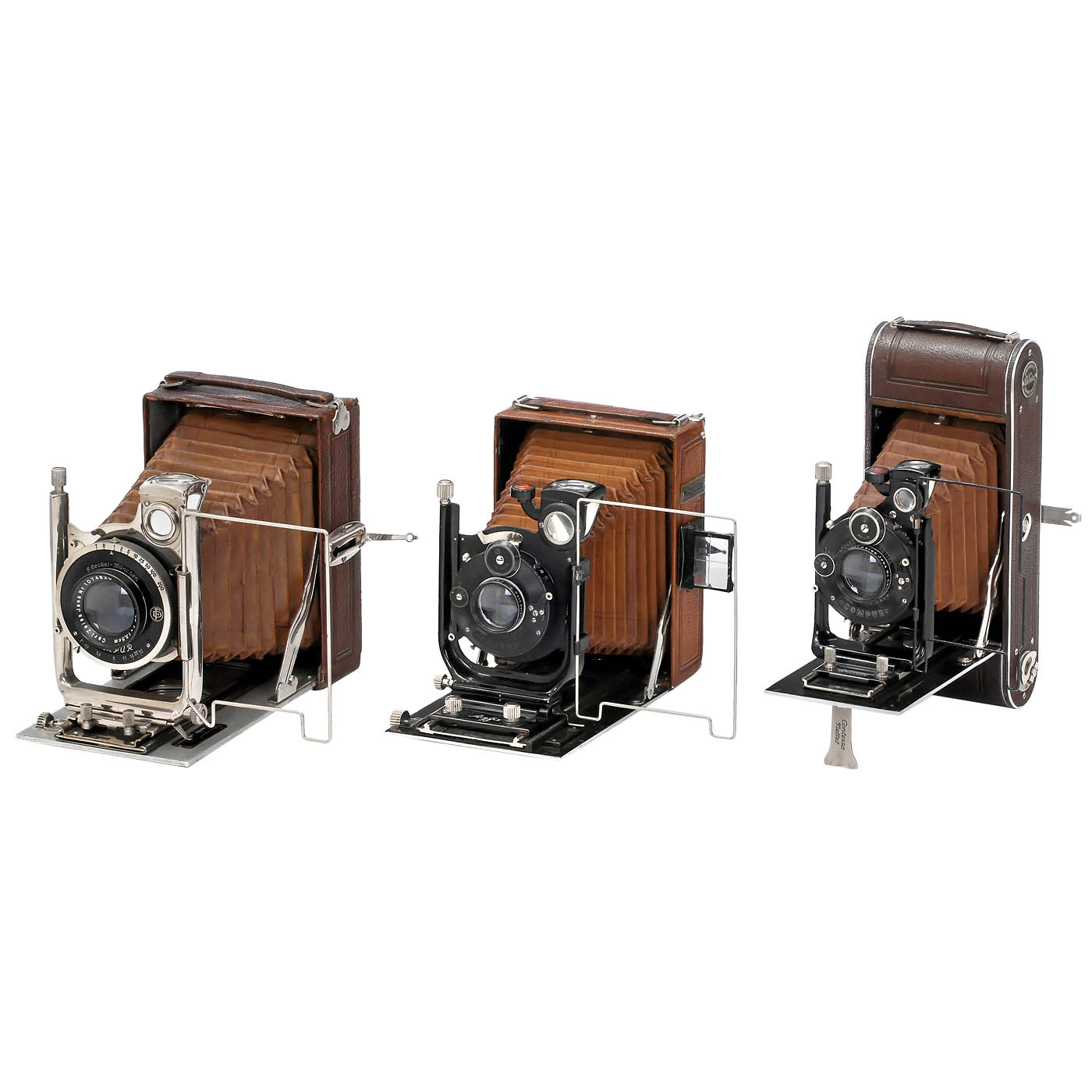 1) Agfa, Munich. Isolar Luxus, for 9 x 12 cm, brown leather, brown bellows, with Zeiss Jena Tessar 6,3/15 cm, with focusing screen back. (3/3) – 2) Contessa Nettel, Stuttgart. Cocarette II, no. 395720, for 5,5 x 11 cm on 72 mm wide rollfilm, brown leather, brown bellows, with Zeiss Jena Tessar 4,5/12 cm. (3+/3+) – And: 3) Probably France. For 9 x 12 cm, brown leather, brown bellows, with Zeiss Jena Tessar 4,5/13,5 cm, with focusing screen back. (3/3)