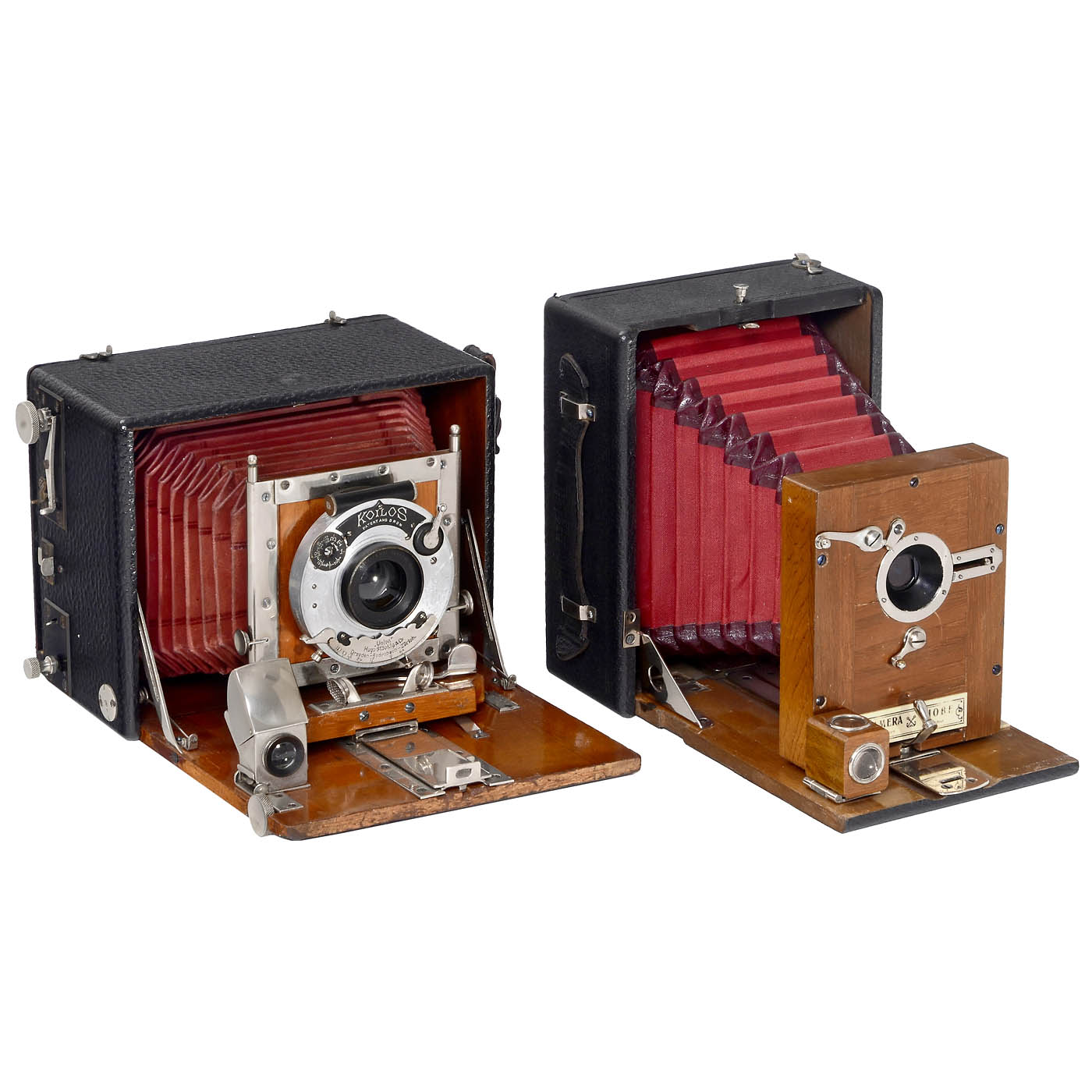 1) Hugo Stöckig, Dresden. Union 27 "Zwei-Verschluß-Kamera", attractive print on shutter cloth, changeable lens with Koilos shutter, unusual interesting Goerz Double-Anastigmat series III no. 0 lens, without number or reference to Berlin (probably a contemporary copy), with focusing screen back, focal plane shutter sluggish. – And: 2) Germany. Camera Niobe, 9 x 12 cm, tropical hardwood housing, nickel-plated fittings and lens with slingshot shutter, purple bellows with red corners, in fine condition, with a later focusing screen back. – An attractive and previously undocumented camera.