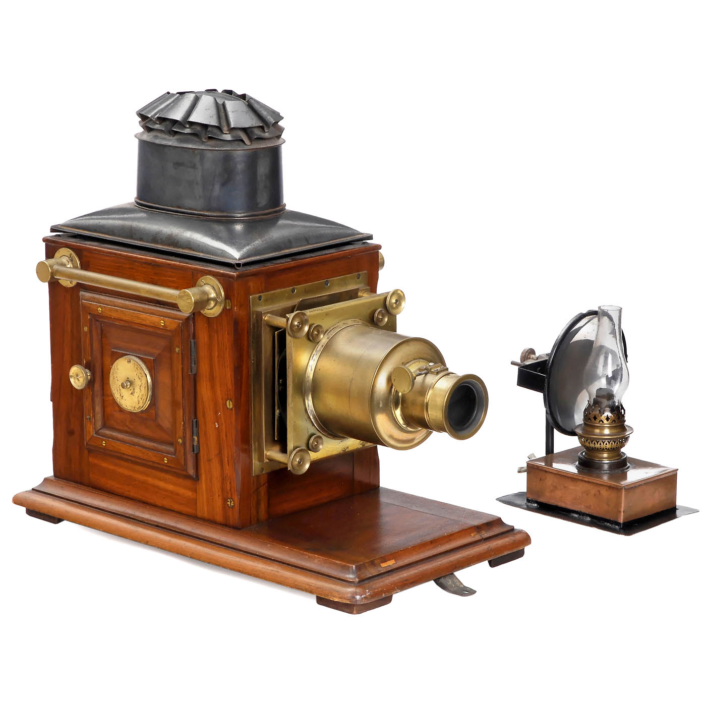England, mahogany with brass fittings, condensor Ø 10 cm, with brass-bound Petzval-type lens of approx. 4/15 cm and burner with large mirror, lens missing an internal spacer ring, otherwise good condition.