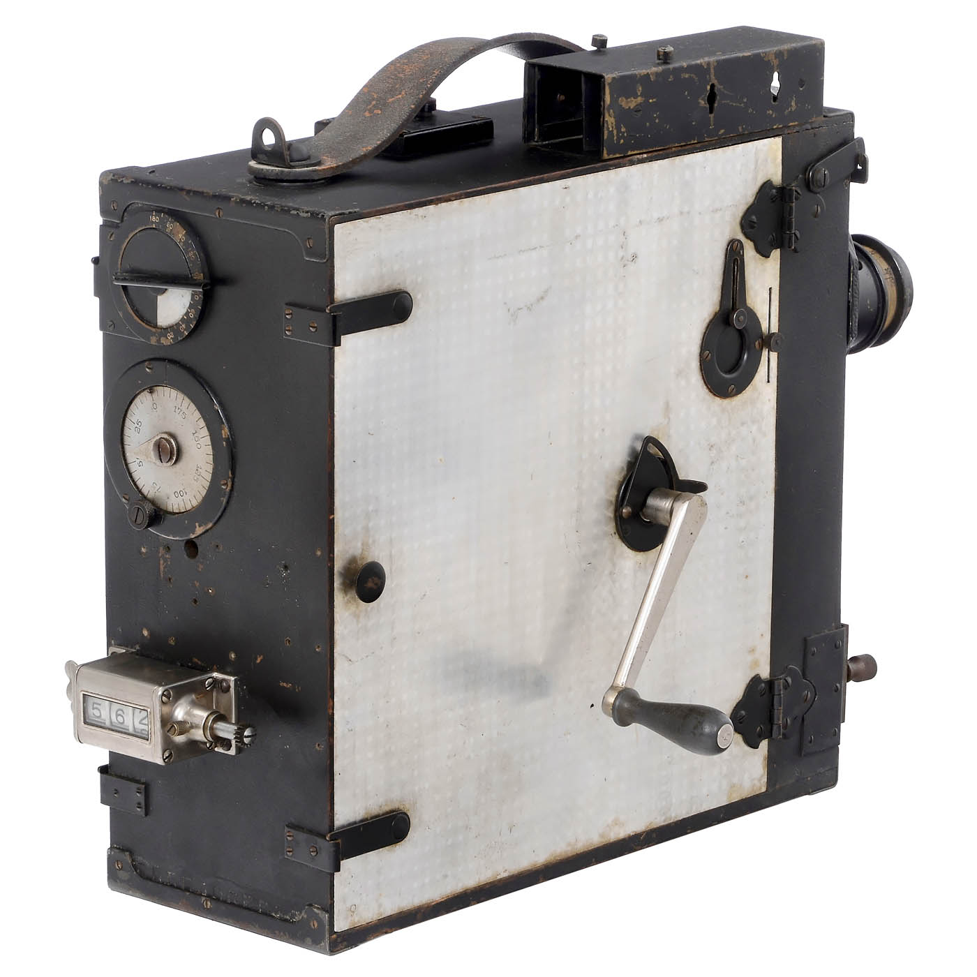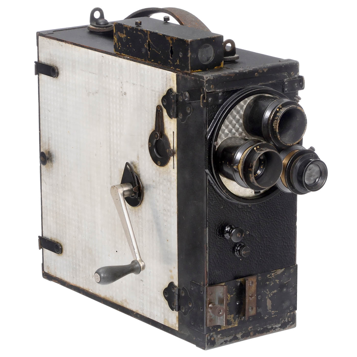 Burke & James, Chicago. No. 2635, hand-crank camera 35mm film camera, for 60 meters film on metal cassettes (2 inside), with hand-cranked mechanism, attached Newton finder with interchangeable masks, triple turret with Goerz Hypar 3,5/3 in., Goerz Dogmar 4,5/4 in. and Bausch & Lomb Tessar 3,5/50 mm lenses. – In addition: Crank and attachable special-effects compendium. – Rare film camera from the time of World War I.