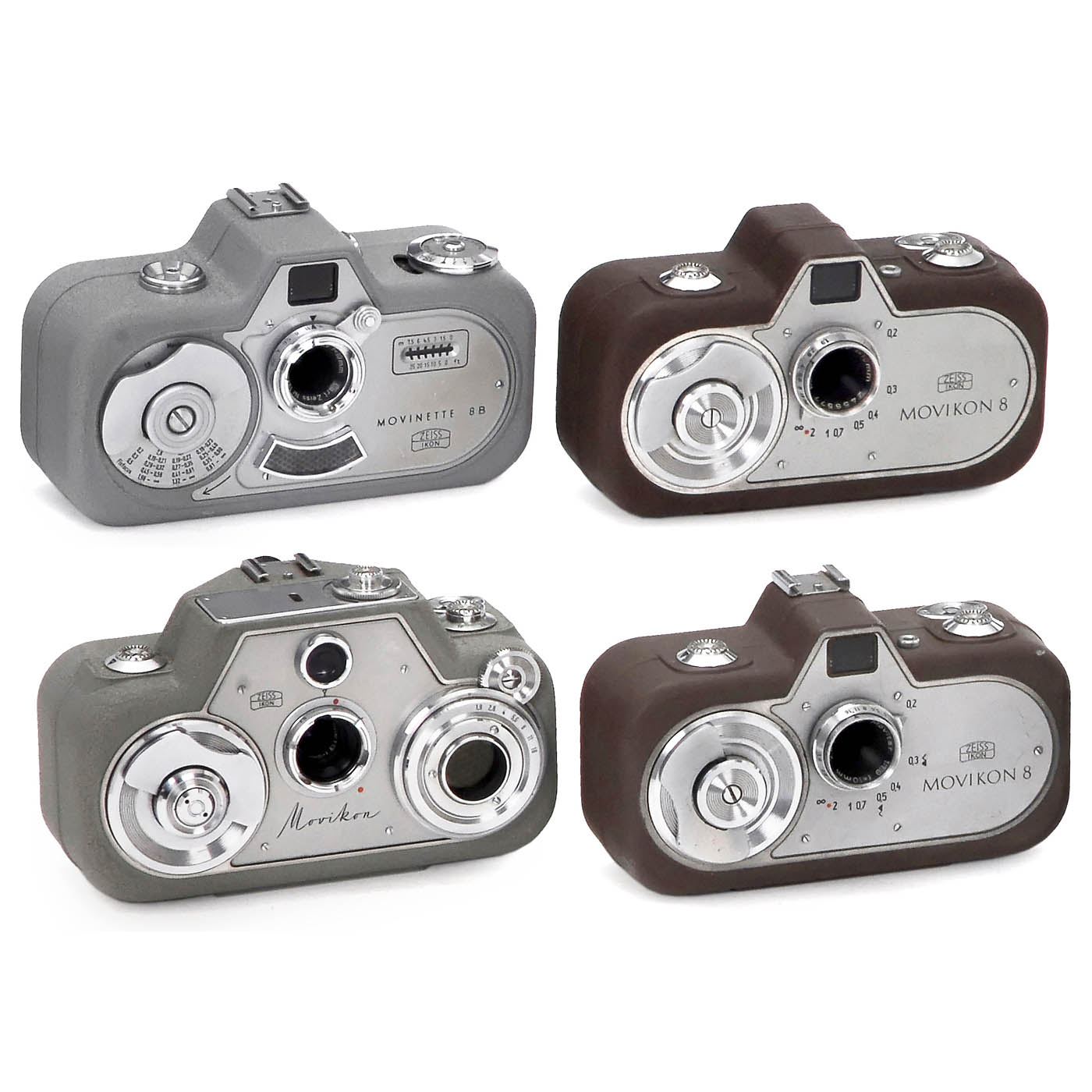 Zeiss Ikon, Stuttgart. Movikon motion picture cameras vertical for 7,5 m film on double-8 spool, with spring-drives. 1) Movikon B, in brown. – 2) Movikon 8, in brown with accessory shoe. – 3) Movinette 8B, Triotar 2,8/10 mm. – 4) Movikon, Tessar 1,9/10 mm, selenium meter works. – And: 5) Film projector Movilux 8B, in original maker‘s box. – Electrical functions untested.