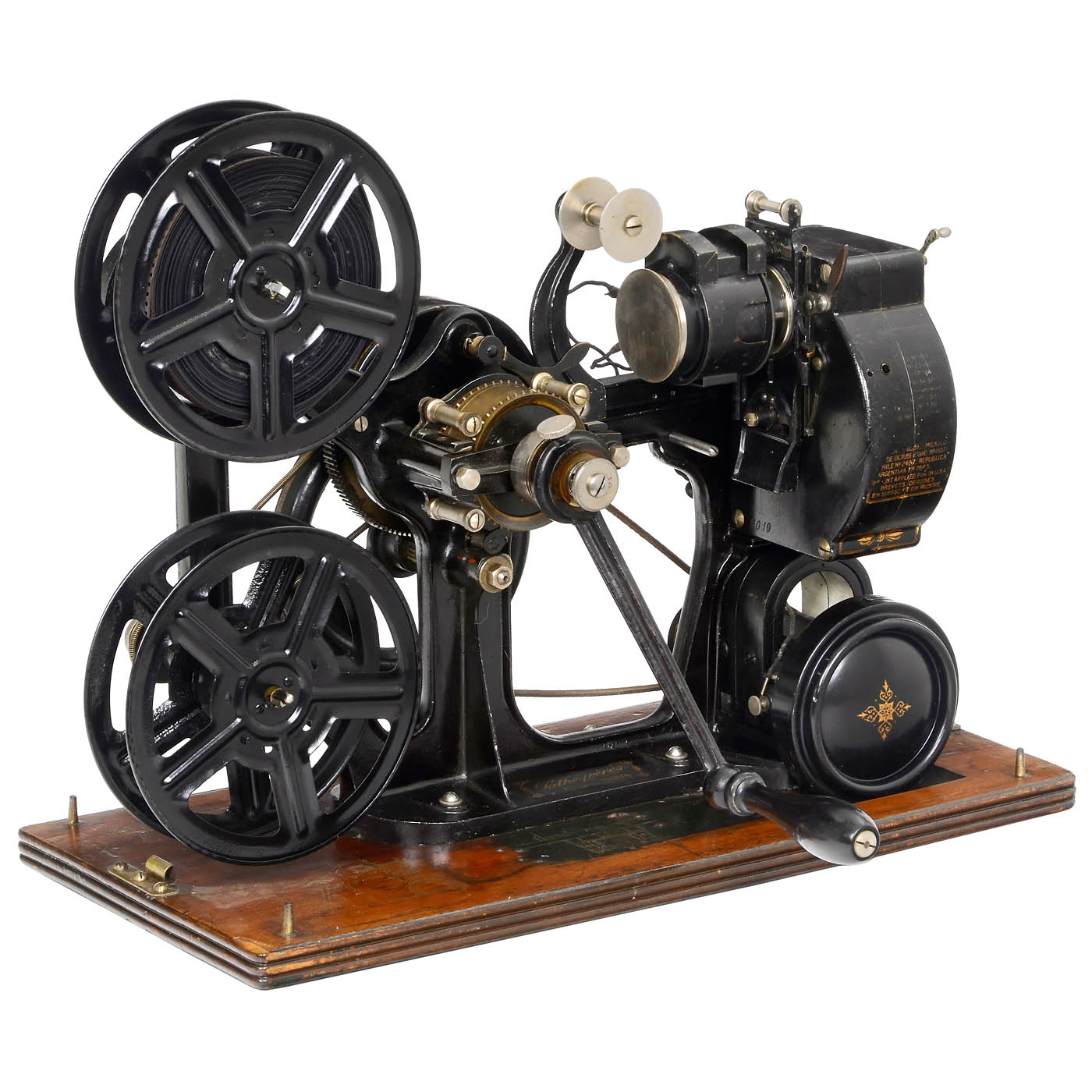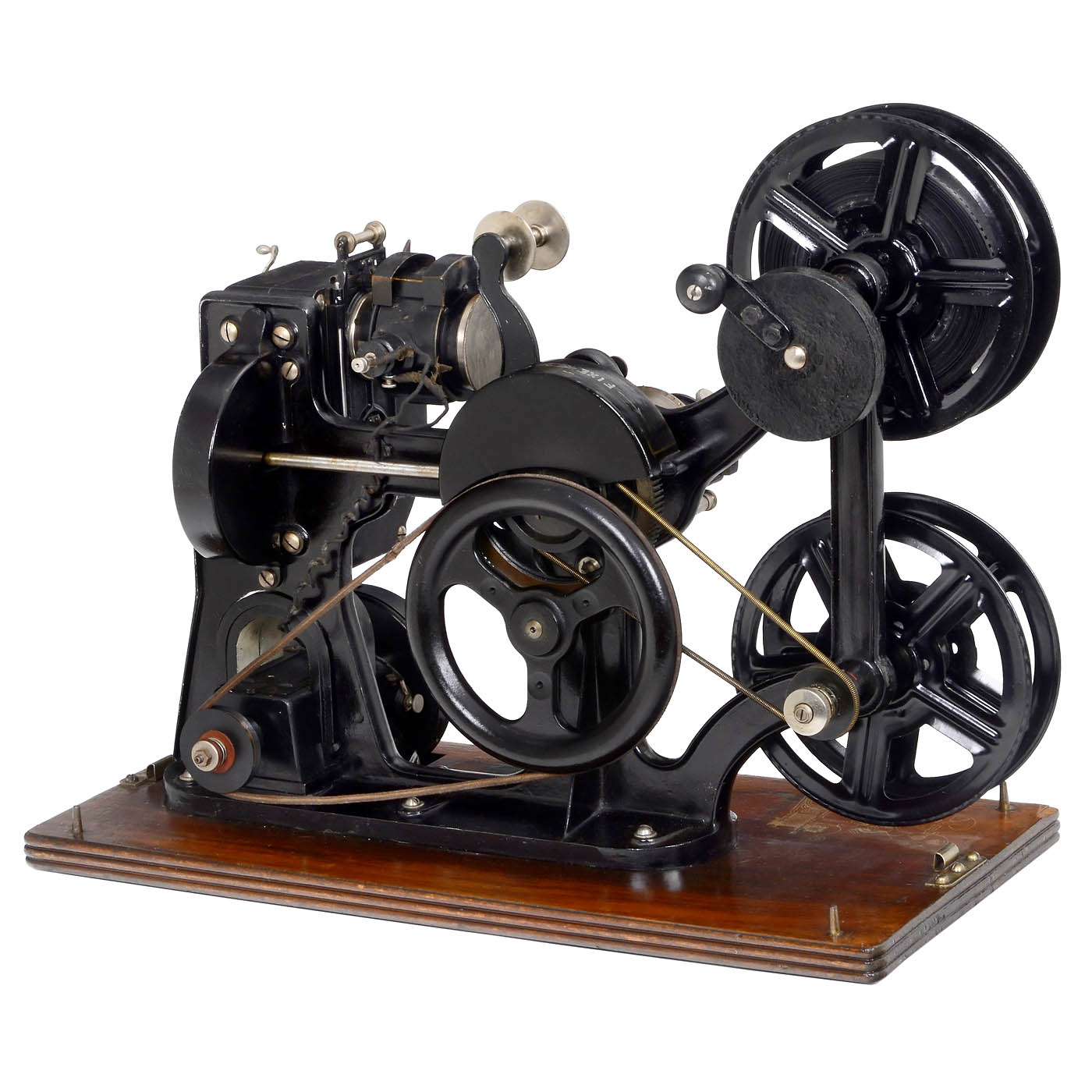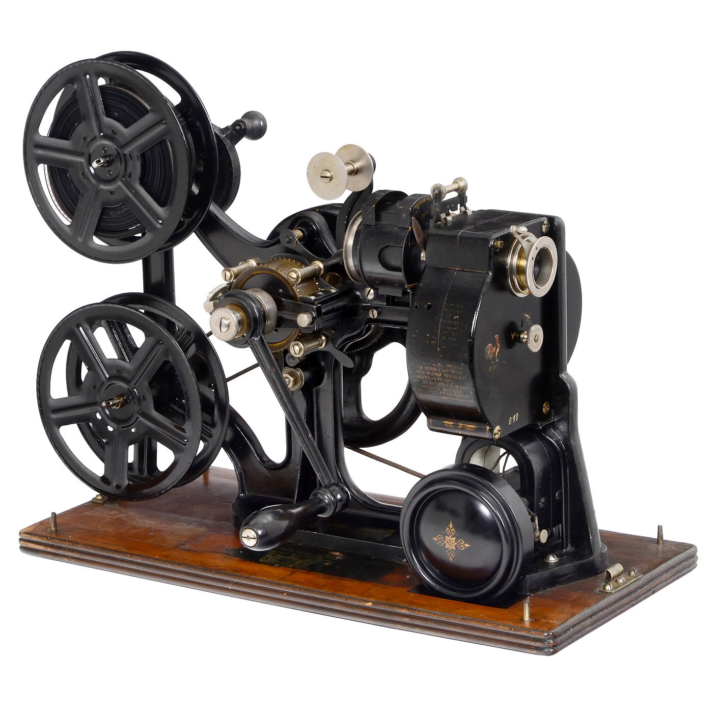 Pathé Frères, Paris. Table cinematograph for 35mm silent films on 200-meter reels, with attractive operating diagrams on the baseboard, electrical functions untested. – Note: Turning the oversized hand crank not only moves the film transport, but also the dynamo that generates the electricity for the built-in low-voltage lamp. Before and immediately after the First World War, many smaller communities were not yet connected to the electricity grid.