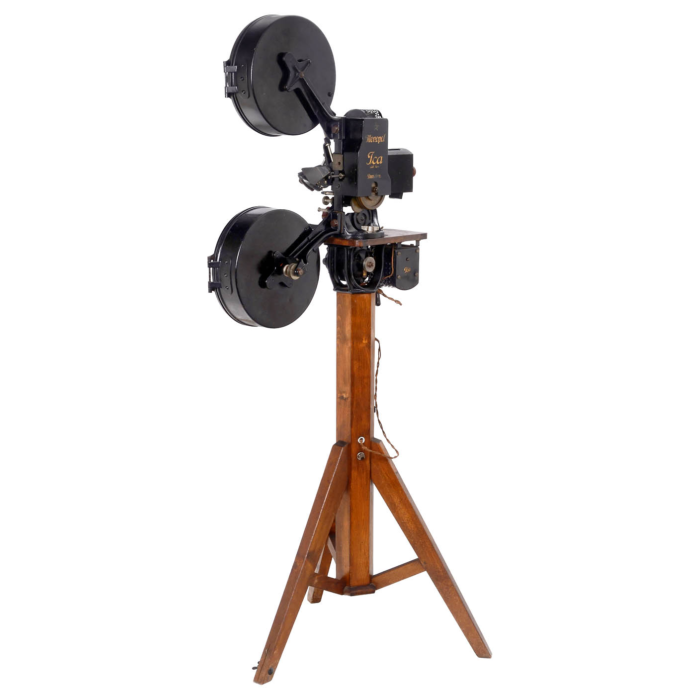 ICA AG, Dresden. For 35mm films on 400-meter spools, with hand-cranked mechanism or electric motor, rare ICA carbon arc lamp, Maltese cross transport, rotating centrifugal shutter for switching from still to moving images and a Meyer Görlitz Kinon 75mm lens, electrical functions untested. The earliest version of the widespread ICA Monopol.