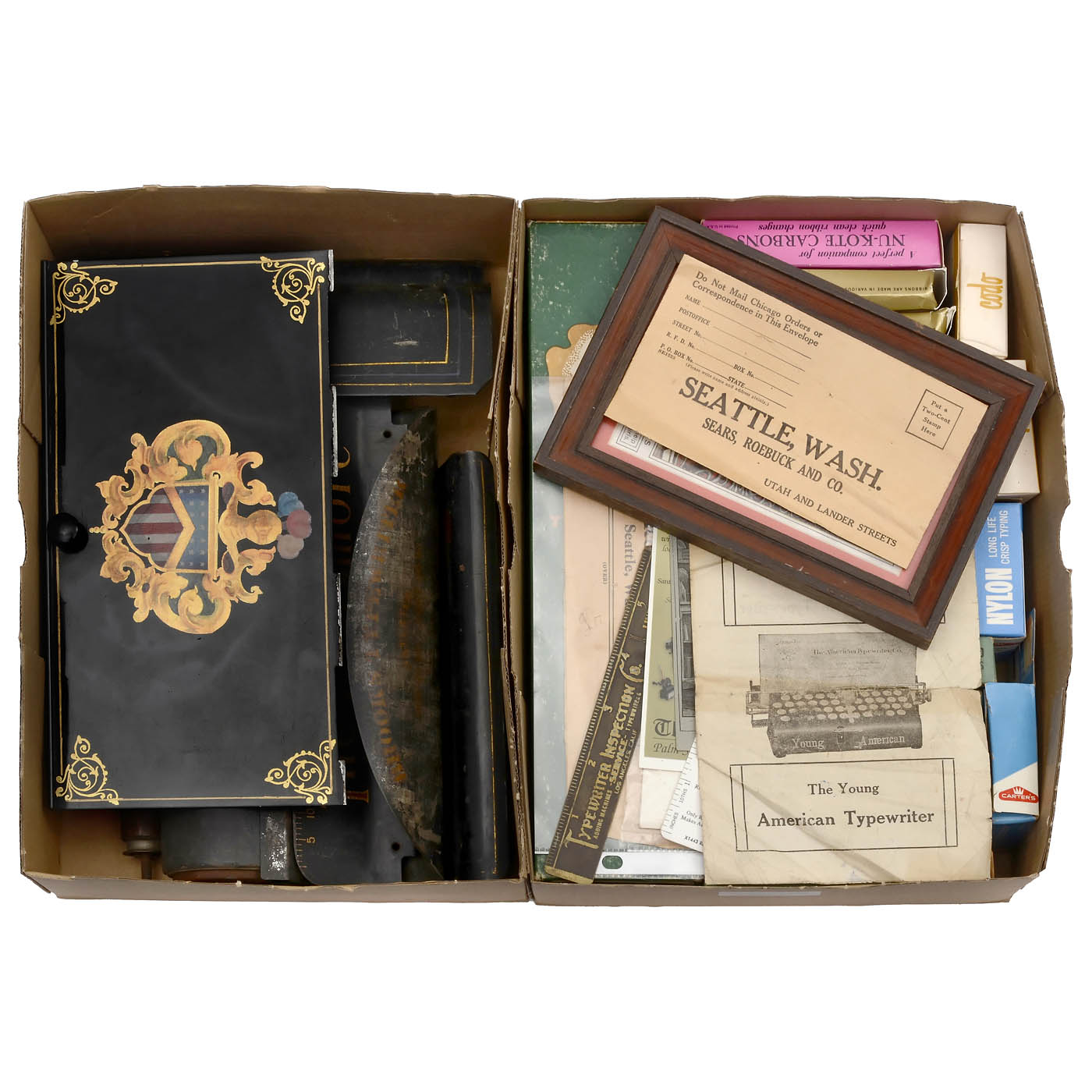 1) Approx. 50 metal spools. – 2) Approx. 45 ribbons. – 3) Brushes, oil and paint. – 4) Box of small parts and keytops (unsorted). – 5) 2 old Remington award badges. – 6) Remington 2: large paper platen and wood roller. – 7) Paper tables: 1 for Brooks and 4 for Remington. – 8) Exercise board for Remington-Rand Tuch-Rite. – 9) Original advertisement for Sholes & Glidden, 1875, framed. – 10) 8 old postcards. – 11) Sholes & Glidden, key cover, repainted. – 12) 5 issues of "Scientific American", 1887, with reports on the first American typewriters. – And: 13) Other advertising items.