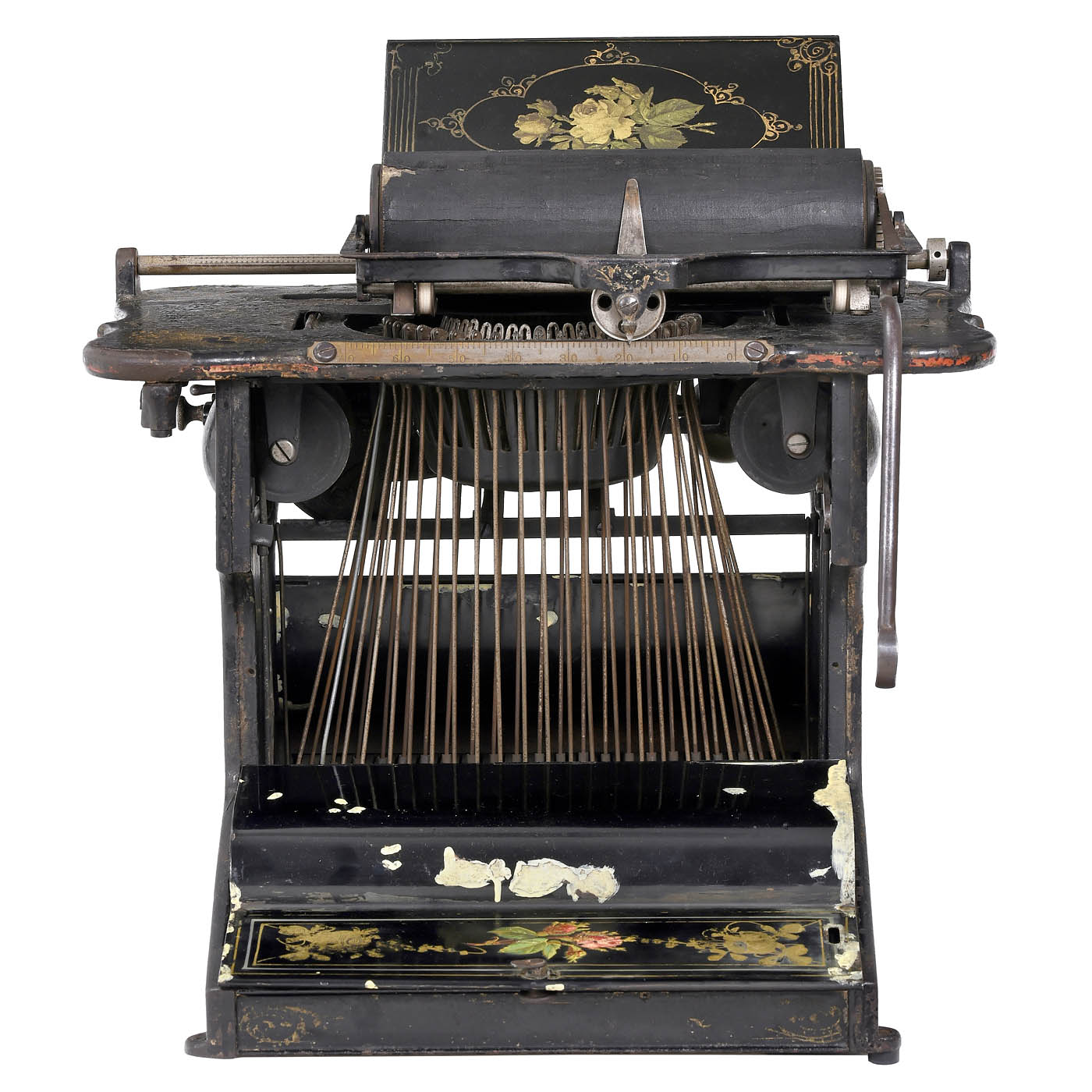 E. Remington & Sons, Ilion, New York. Serial no. A-961, early American upstroke machine, with detailed painted floral decoration and top carriage-return lever, capital keys (no lower case), glass keytops and wood key levers, with metal lid, on typewriter table with cast-metal base, working, mechanism somewhat sticking. – Literature: Martin, 1949, p. 67. – Introduced at the Philadelphia Centennial of 1876, the Sholes & Glidden was the first commercially successful typewriter. It was produced in a number of different finishes, both decorative and functional. – A milestone in the history of office communication.