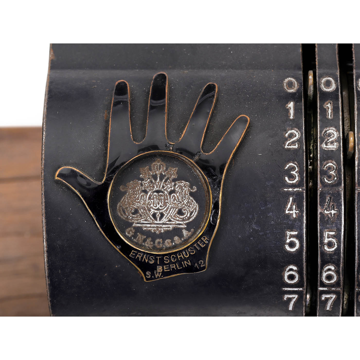 Grimme, Natalis & Co., Braunschweig. Serial no. 3744, Schuster-Brunsviga and hand logo for the Berlin general retailer Ernst Schuster, with 9, 8 and 13 digits and wing-nut clearance. The very first German spoked-wheel calculator, working.