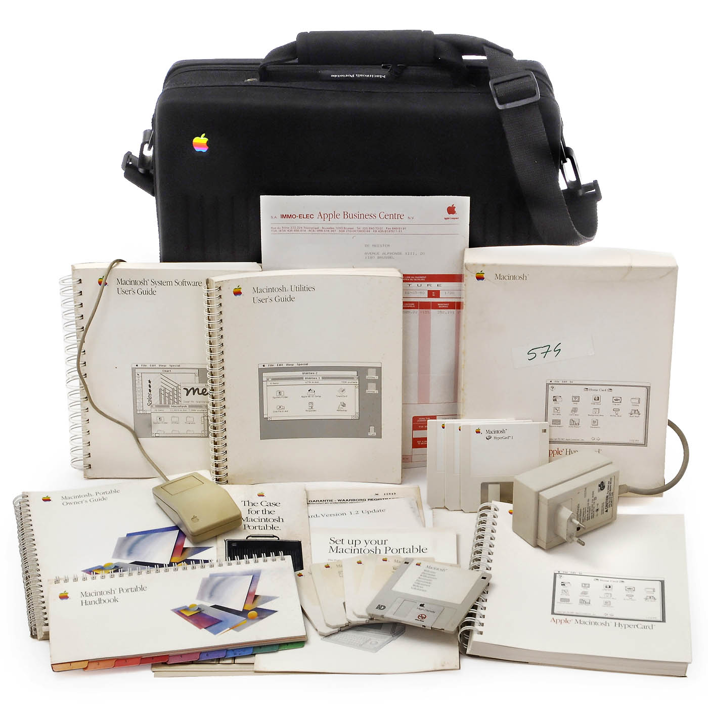 The first Apple laptop, mains-independent with built-in battery, 40 MB hard disk, 3.5-inch drive, trackball, 9.8-inch active matrix display, with power supply, Apple Mouse, 5 starter floppy disks, 3 Apple manuals and software Apple HyperCard in suitcase, complete and in very good optical condition, but untested. – Provenance: Property of Baron de Meester (Brussels), with original invoice for the amount of 300,000 Belgian francs (the equivalent of around $16,000 in 2022).