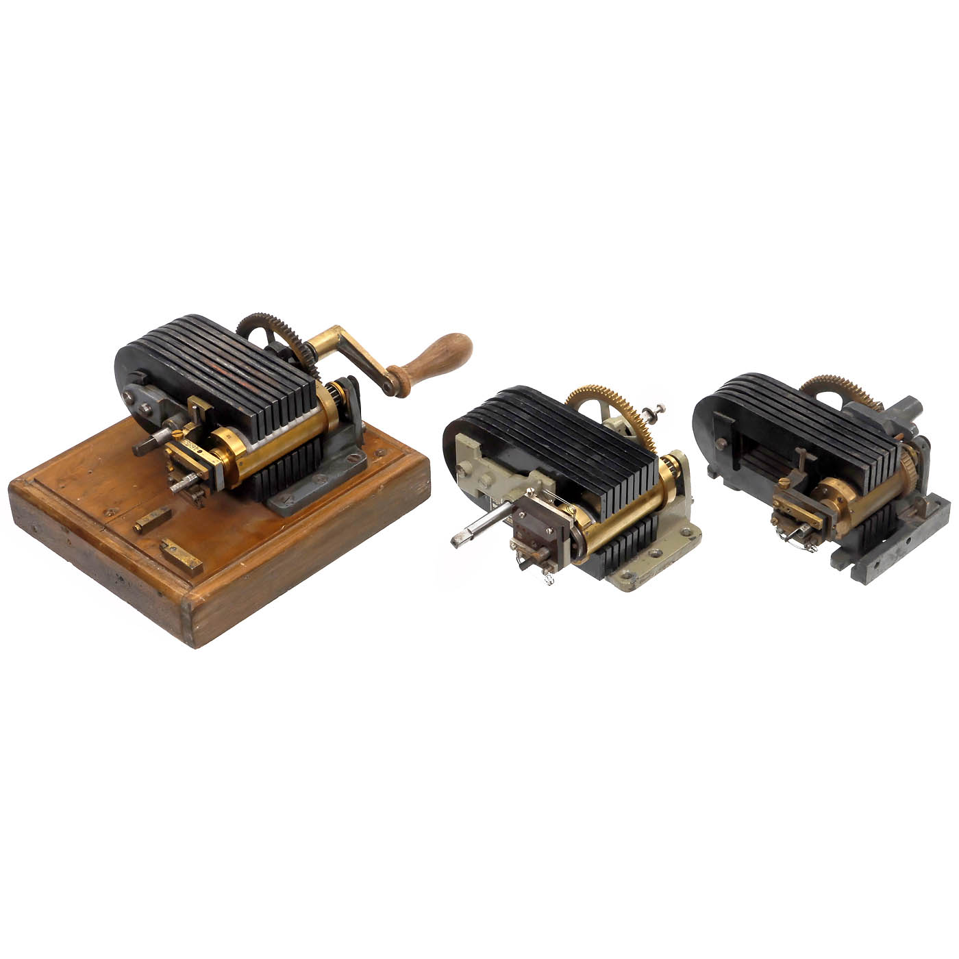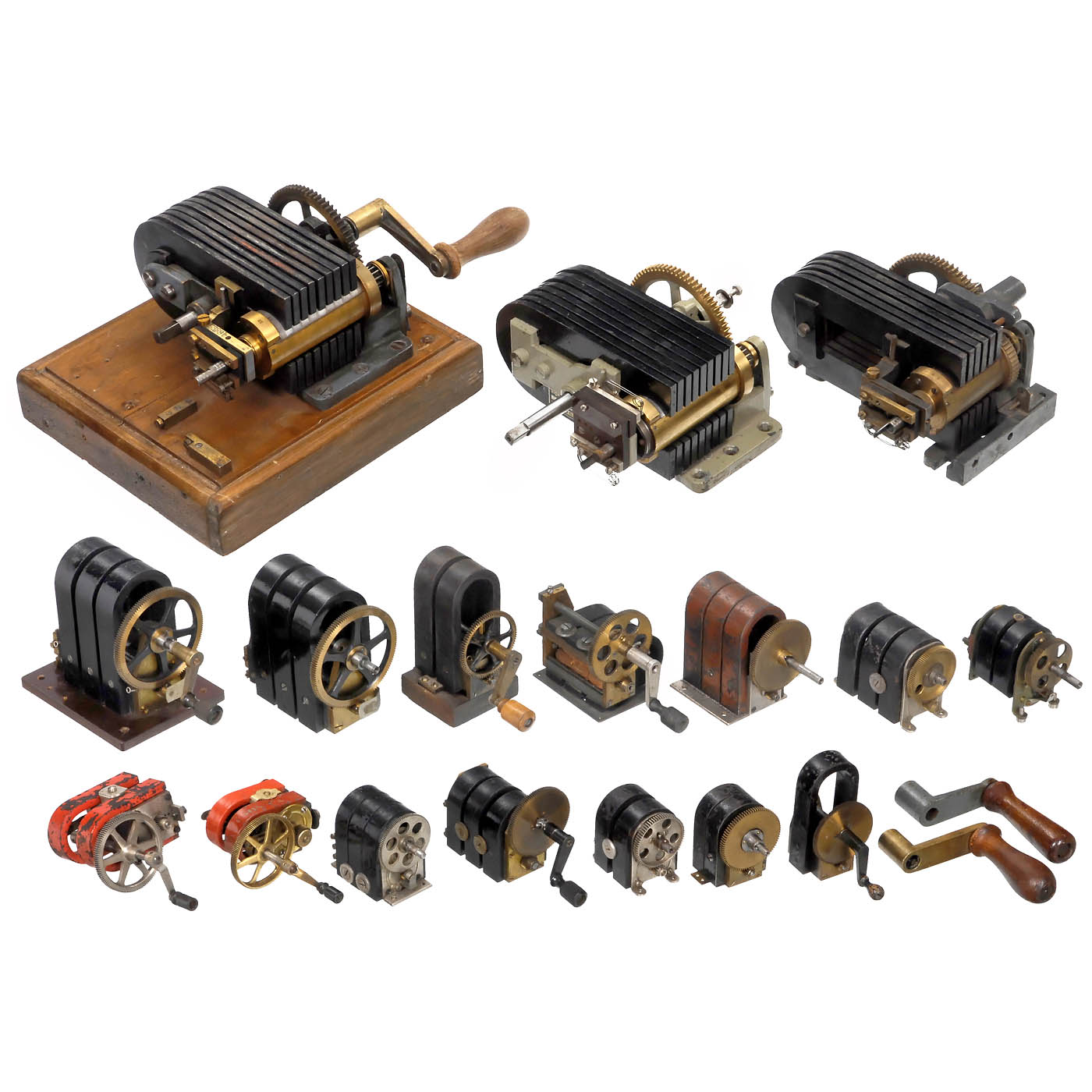 1) 2 large crank inductors by Siemens & Halske, with double-T armatures, for power generation for telegraph lines over long distances, first used on the Indo-European telegraph line. – 2) Large crank inductor, unmarked. – And: 3) 14 crank inductors, various designs, mostly without manufacturer's specification, seven of them with crank.