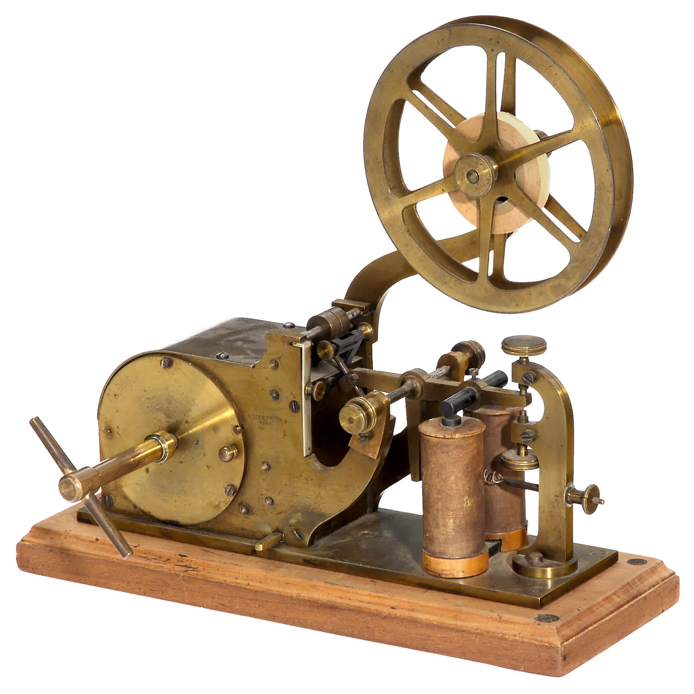 O. Schaeffler, Vienna, Austria. No. 2313, Kapsch & Söhne system, spring drive (working), original lacquered brass, walnut baseplate, size 14 x 5 ¼ in.