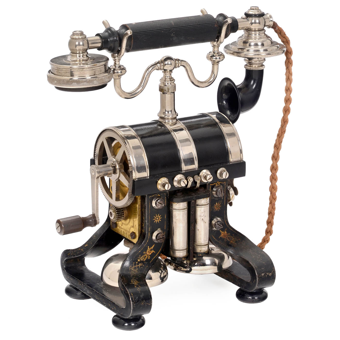 A.B. Telefonfabriken, Stockholm, Sweden. With extremely rare semi-circular crank inductor cover, partially restored, complete and with beautifully preserved decoration. – Note: Manufactured for the state-owned nationwide "Rikstelefon" network, which was taken over by the American "Bell Company" in around 1901. – One of the earliest and rarest non-Ericsson telephones!
