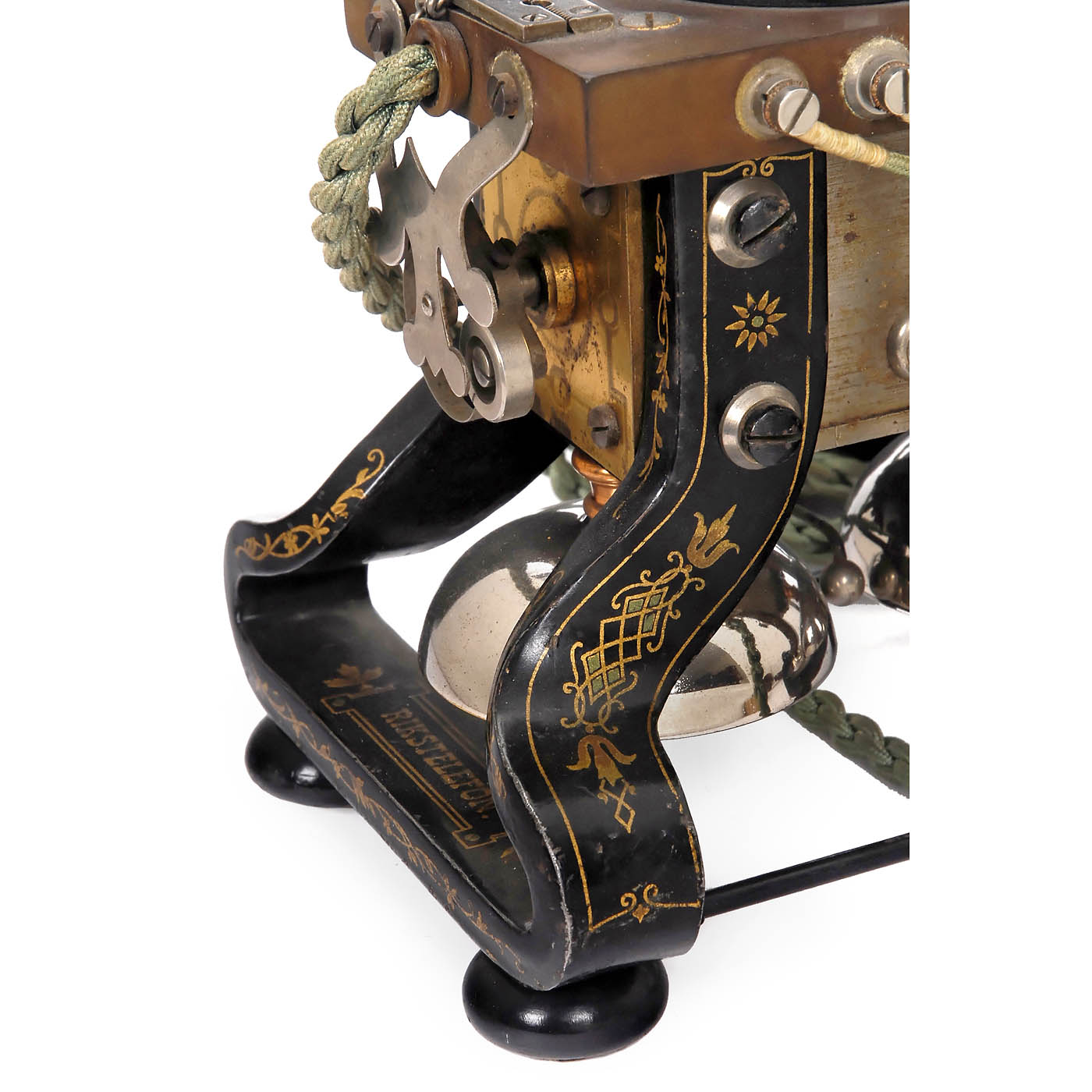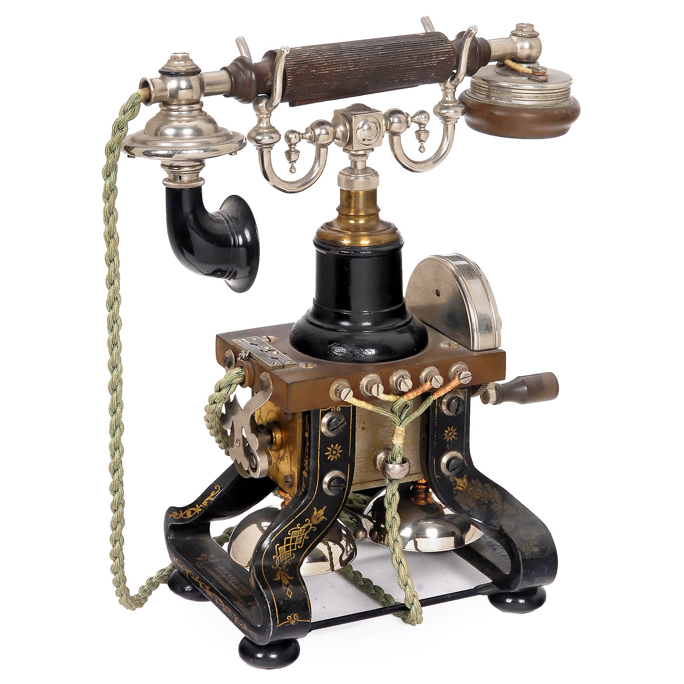 L.M. Ericsson, Stockholm, Model AC 110, handset with speaking horn, with lightning protection, centrifugal switch, ebonite plate with 5 terminals, crank inductor, double alarm clock. – Very good original condition, including the beautifully preserved decoration.