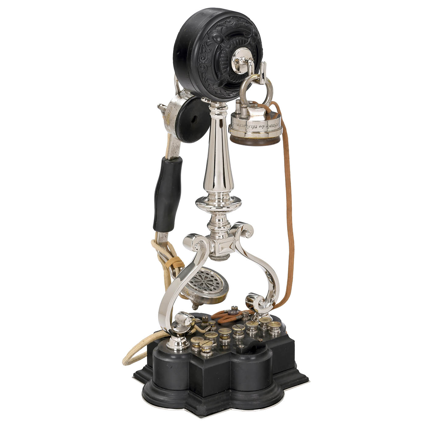 Société Industrielle des Téléphones, Paris (S.I.T.), serial no. 5063, handset and second hearing device by the same maker, ebonite base and head, height 15 ½ in., good restored condition. – A very unusual telephone from the Belle Époque.