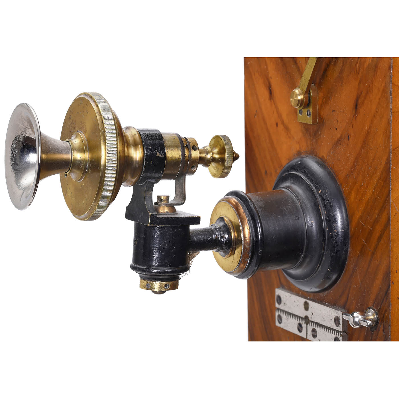 Coffin model, marked: "Patent L.M. Ericsson & Co., Stockholm", with helical microphone, Bell-type receiver, 3-part crank inductor, double bell and crank, wood case. – Literature: Christian Jacobäus, "L.M. Ericsson 100 Years", Volume III, p. 17. – Extraordinarily rare, produced for one year only!