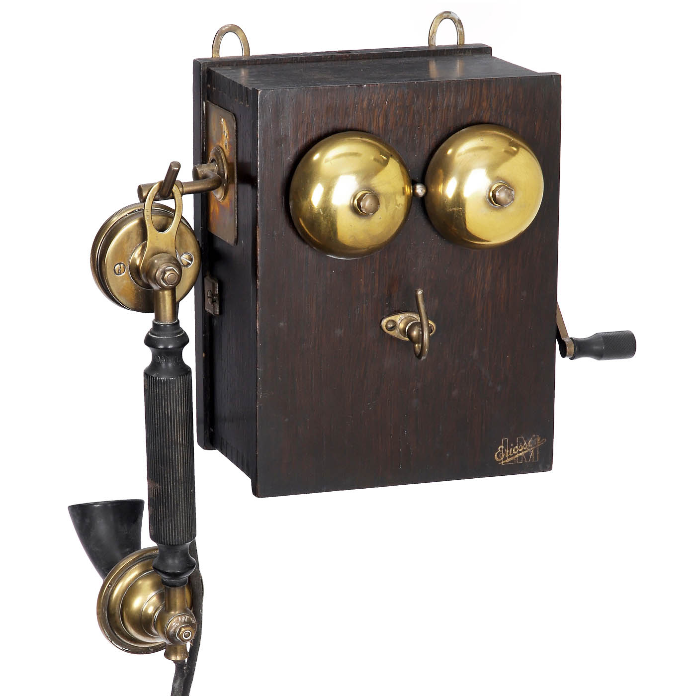 1) Switchboard, type ABH 1106, L.M. Ericsson, for six connections, with bakelite handset. – 2) Wall telephone, Sweden, brass case, double bell, handset with speaking horn. – 3) Switchboard, L.M. Ericsson, with ten flaps, six plugs and a bell. – 4) Wall telephone, unmarked, crank inductor, handset with hygienic microphone. – And: 5) Wall-mounted telephone, L.M. Ericsson, crank inductor, brass bells, handset with speaking horn.