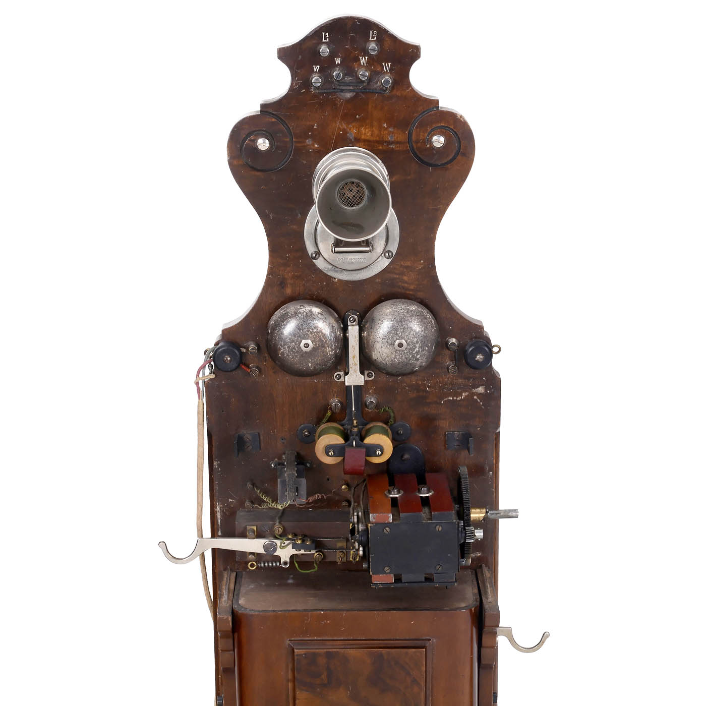 Friedrich Reiner, Munich. No. 17853, standard model of the "Generaldirektion der Königlich Bayerischen Posten und Telegraphen", polished walnut cases, consisting of: carbon granulate microphone with speaking horn on adjustable support, main case with three-part crank inductor and switch, Bell-type earphone, double bell, writing desk and battery case with chromic acid cell, overall height 30 3/4 in. – Very good original condition.