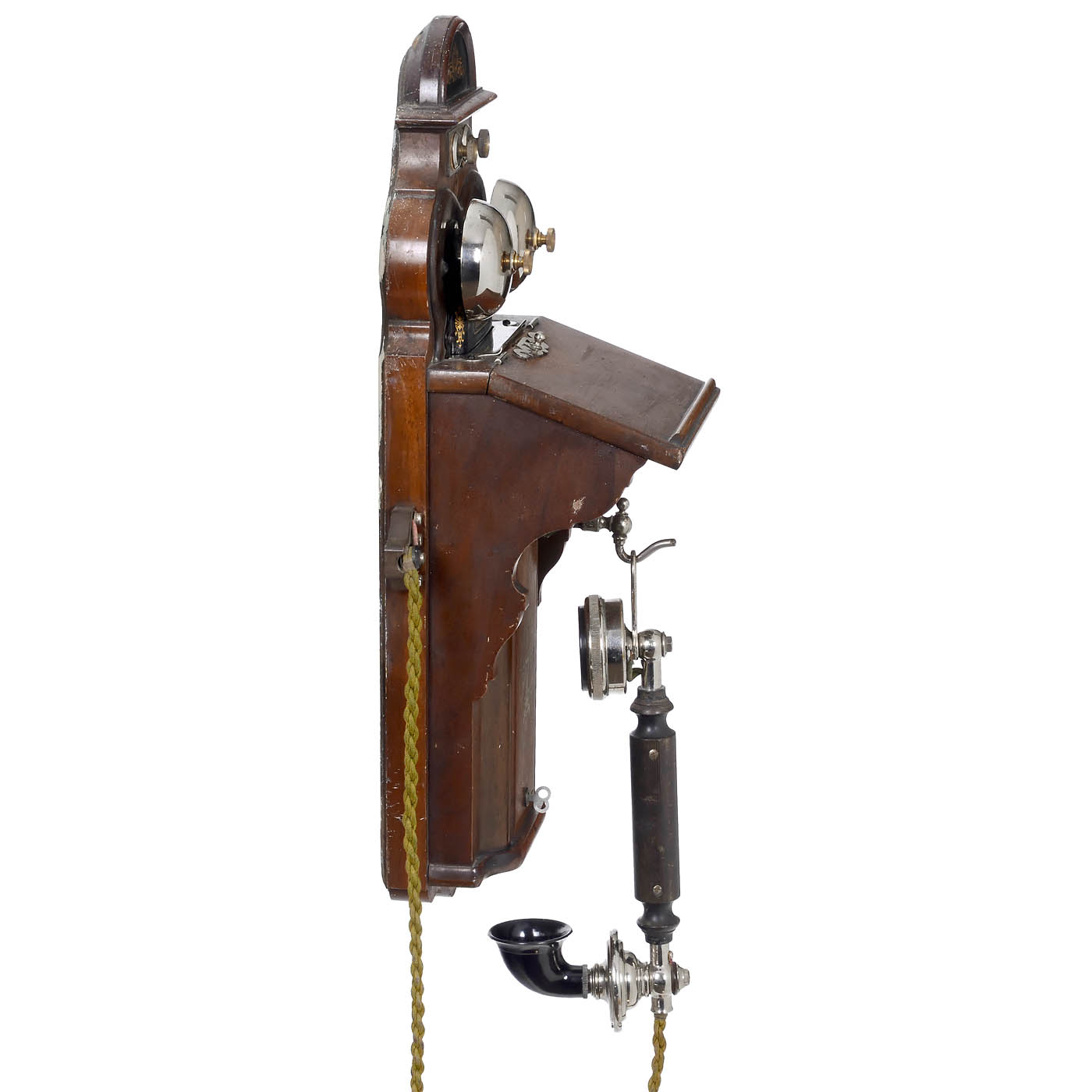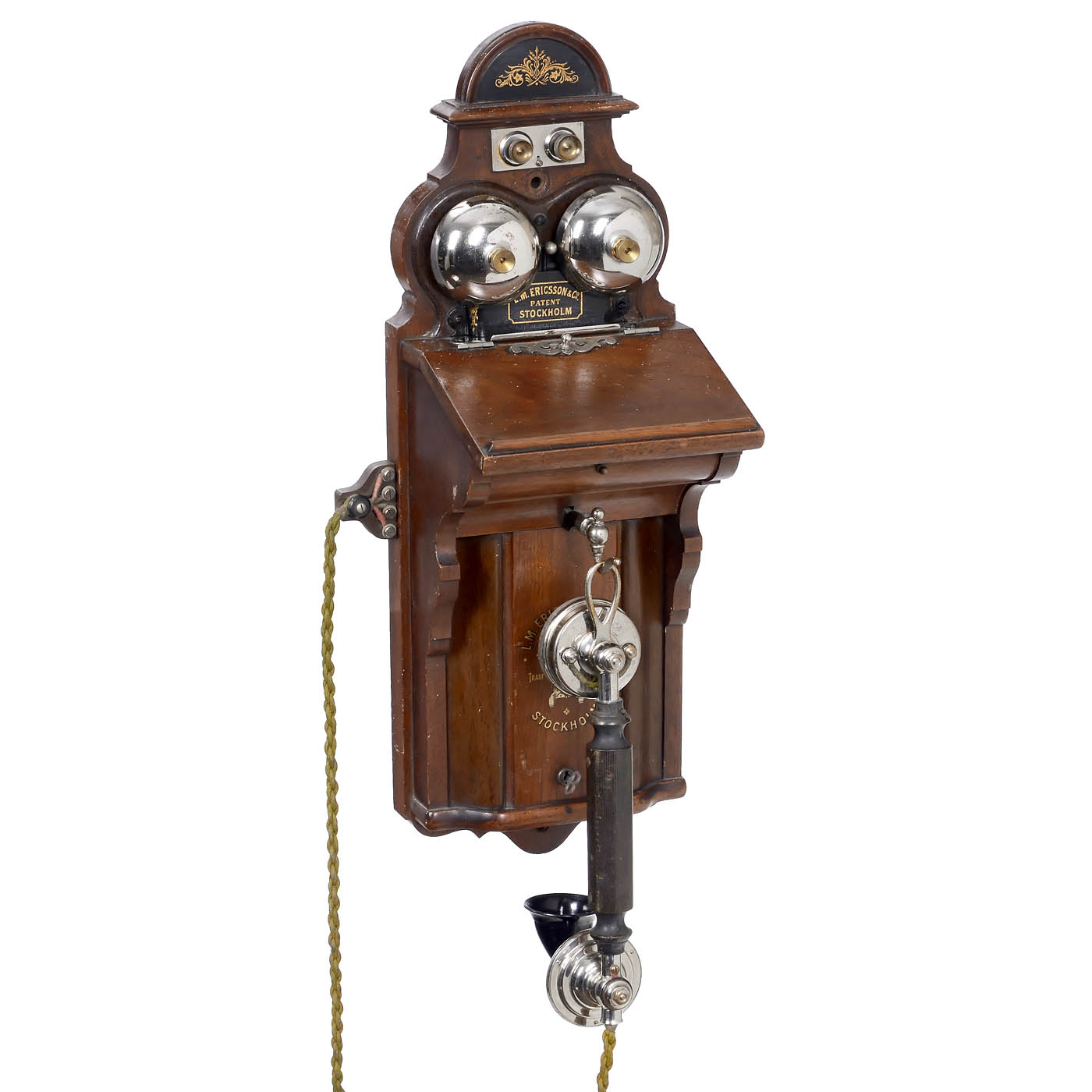 No. 755410, L.M. Ericsson, Stockholm, Sweden, small and narrow model, walnut case, attractive Ericsson transfers, writing slope, cradle under the desk, handset with speaking horn, small battery compartment, double bell, lightning protection, good original condition. A rare model not illustrated in the Ericsson catalogs.