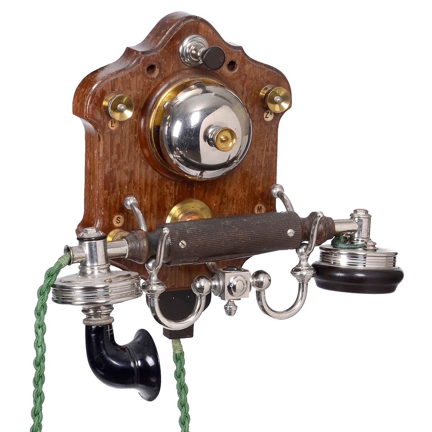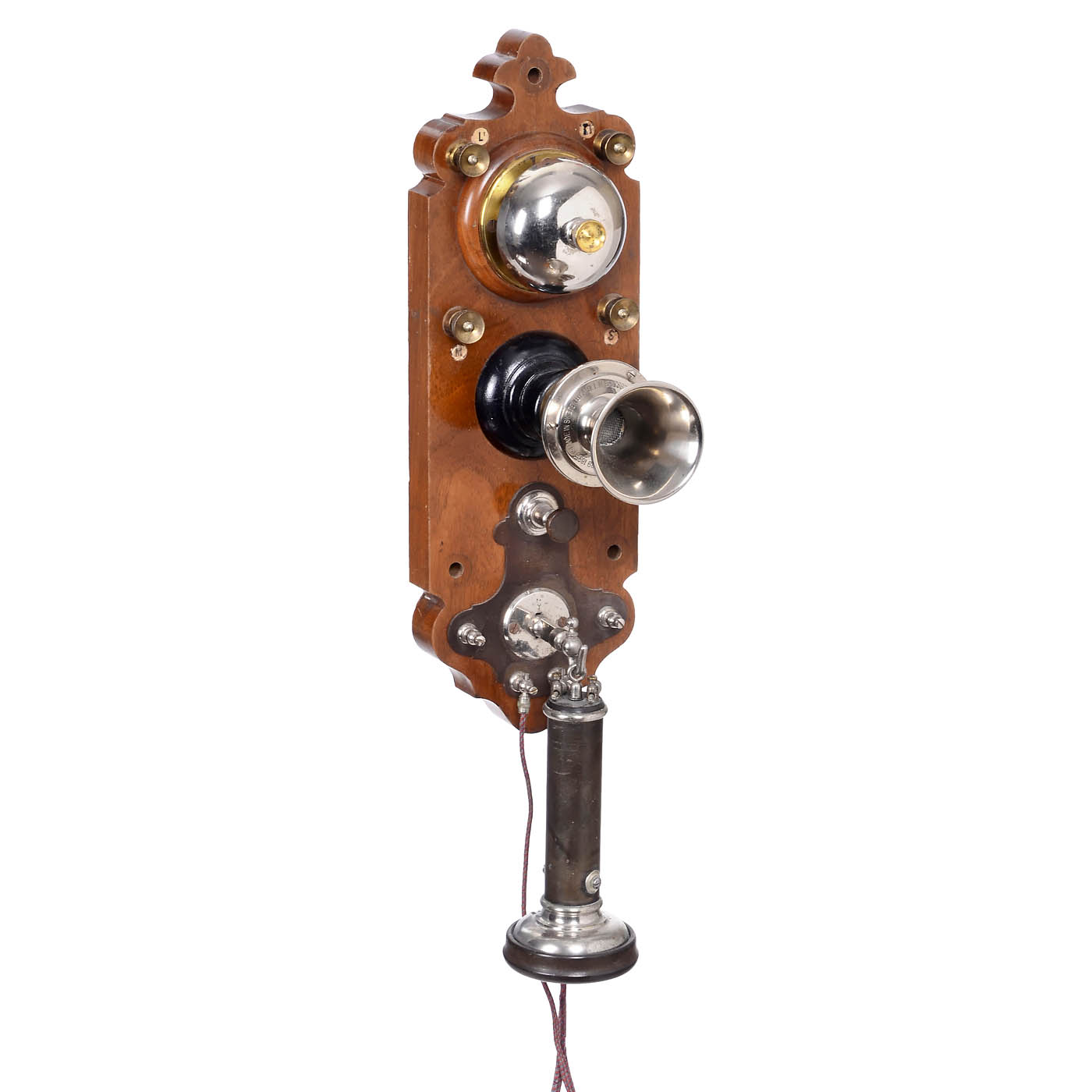 1) Intercom no. 760, for 10 connections, rotary switch, walnut, for wall mounting, handset with speaking horn and button. – 2) Rotary switch for 41 connections, walnut. – 3) Wall-mounted telephone no. 405, walnut, single bell, handset with speaking horn. – 4) Wall telephone no. 410, walnut, single bell, fixed microphone with speaking horn, Bell-type receiver. – 5) Wall telephone, walnut, with cradle, single bell, handset with speaking horn and button. – And: 6) Double bell, walnut, for wall-mounting, with double switch.
