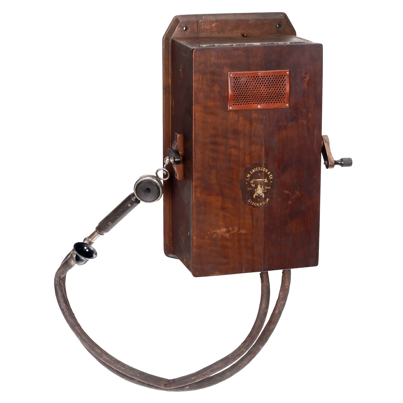 L.M. Ericsson, Stockholm. Magneto wall telephone with special protection against high-tension currents, polished walnut case, interior lined with earthed iron sheets (partially rusty), 5-magnet crank inductor, insulated ebonite crank, double bell, dummy handset, the sound being carried by means of 2 rubber tubes to transmitter and receiver in the case. – A very rare telephone.