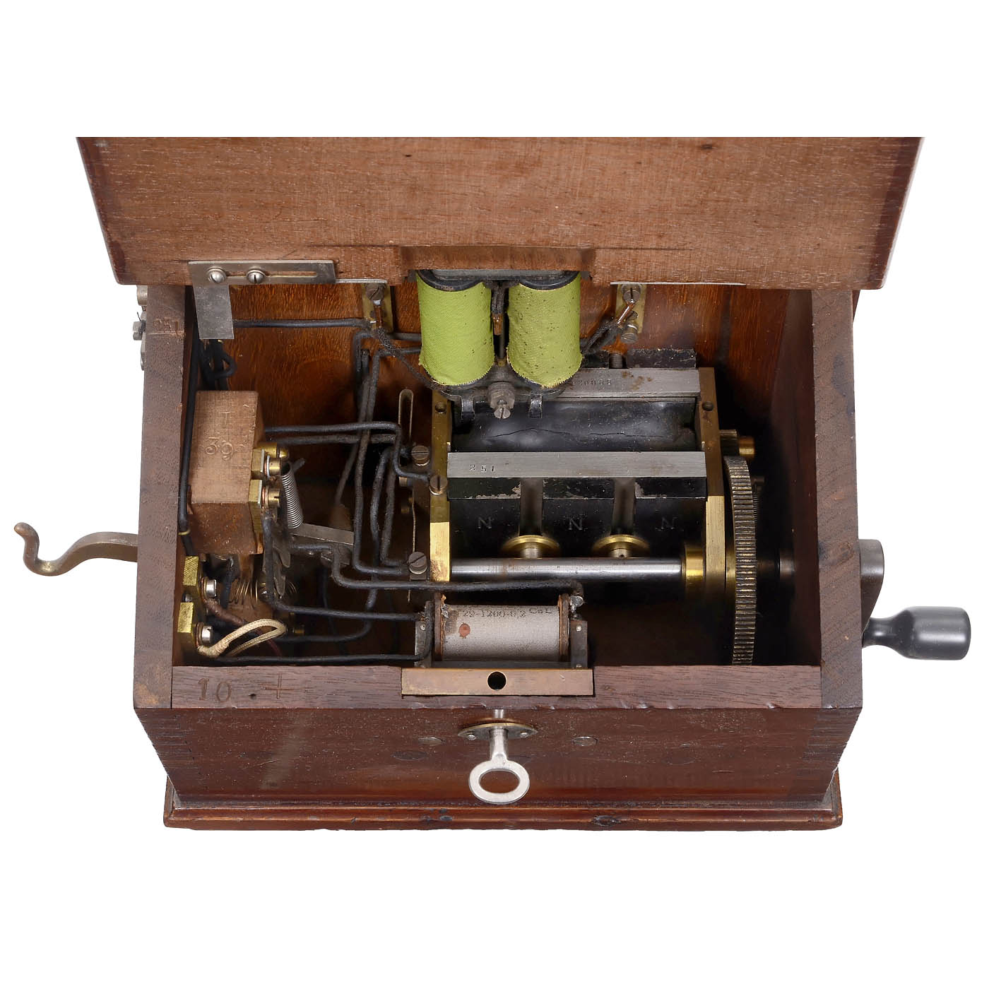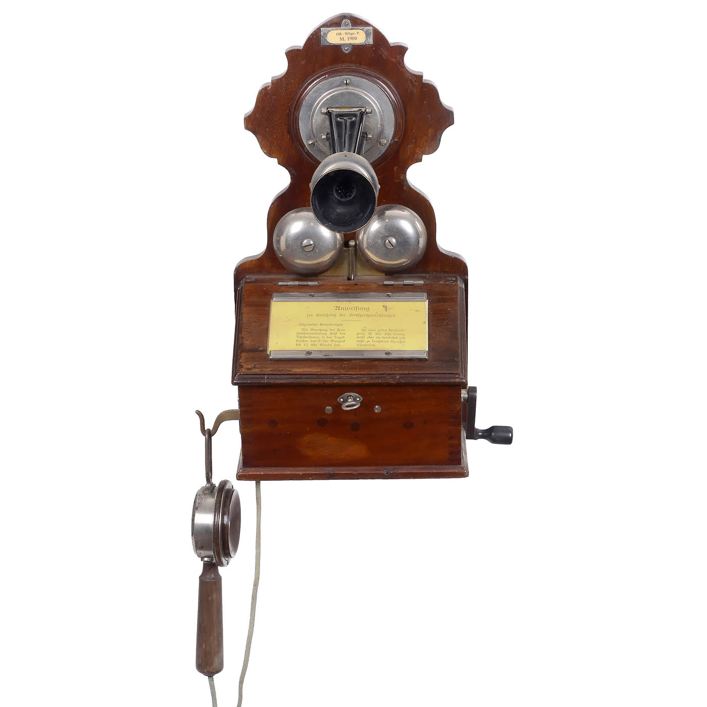 Germany, walnut case, embossed with crown and the date 18.2.08, height-adjustable carbon microphone, three-part crank inductor, spoon-shaped earphone by Schuchhardt, double bell, writing desk, with lock and key.