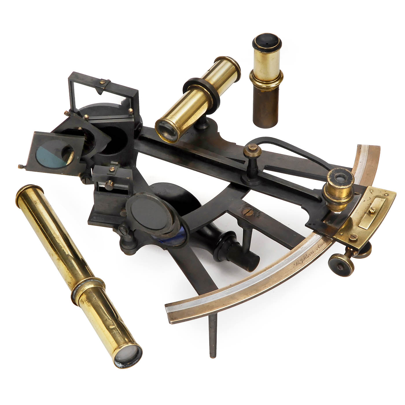 No. 4279, engraved on the arc "L.J. Harri, Amsterdam" (Lendert Johannes Harri), burnished brass, mahogany handle, silver scales, graduation 0–120°, alidade with micrometer fine-screw adjustment, reading magnifier, 7 darkened glasses, index and horizon mirror, 3 sighting telescopes, in matching mahogany case with correction certificate of the Royal Dutch Meteorological Institute in Rotterdam in the lid.