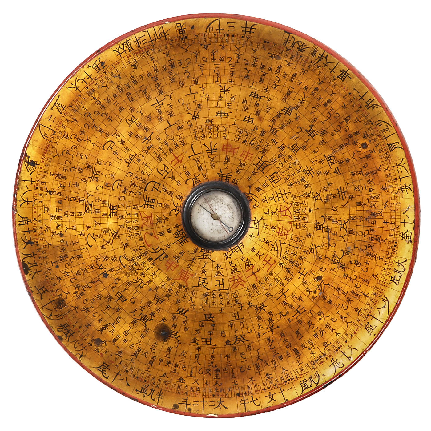 Feng-Shui Luopan compass, circular surface with delicately painted symbols in concentric rings around an inset compass at the center, with typical compass needle of the period, the reverse with tables of Chinese characters, diameter 6 ½ in.