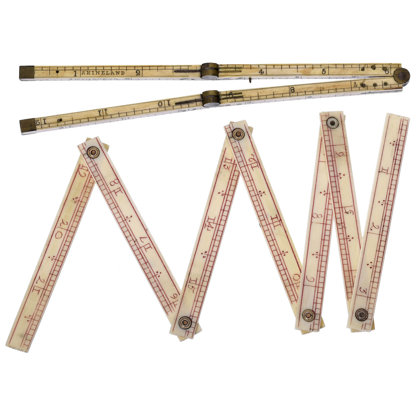 1) Four-fold rule, England, 3 brass joints, square, sides with length measurements for "Rhineland", "Hamburgh", "Paris" and "London", length open 12 ½ in. – And: 2) Folding rule, France, with seven sections, riveted, length open 23 ½ in., in shagreen-covered traveling case.