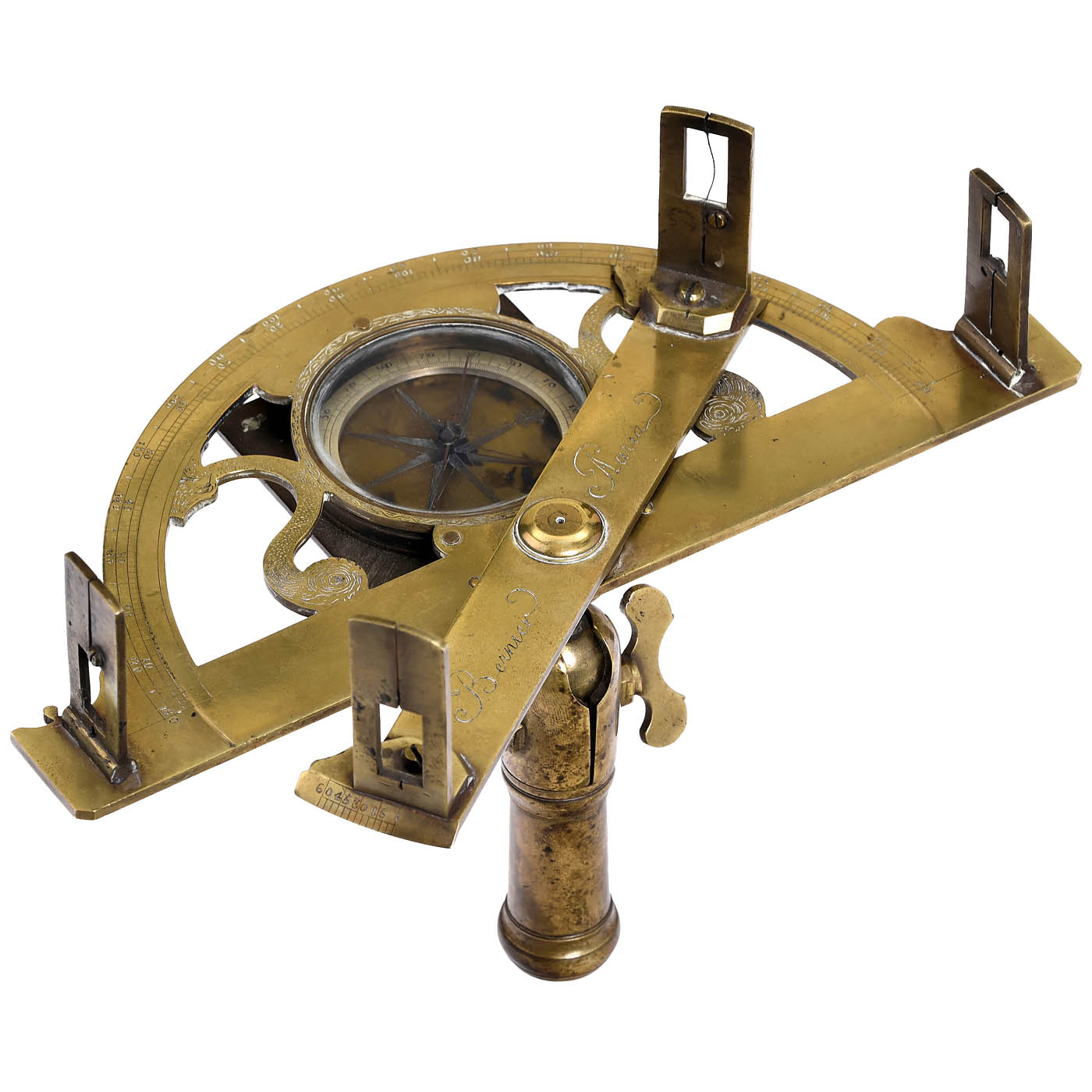 Signed "Bernier, Paris", brass, the protractor arch with engraved scales and 4 sighting vanes, silvered compass scale, Ø 2 1/8 in., instrument diameter 91/4 in., on ball-joint socket for a Jacob's staff.